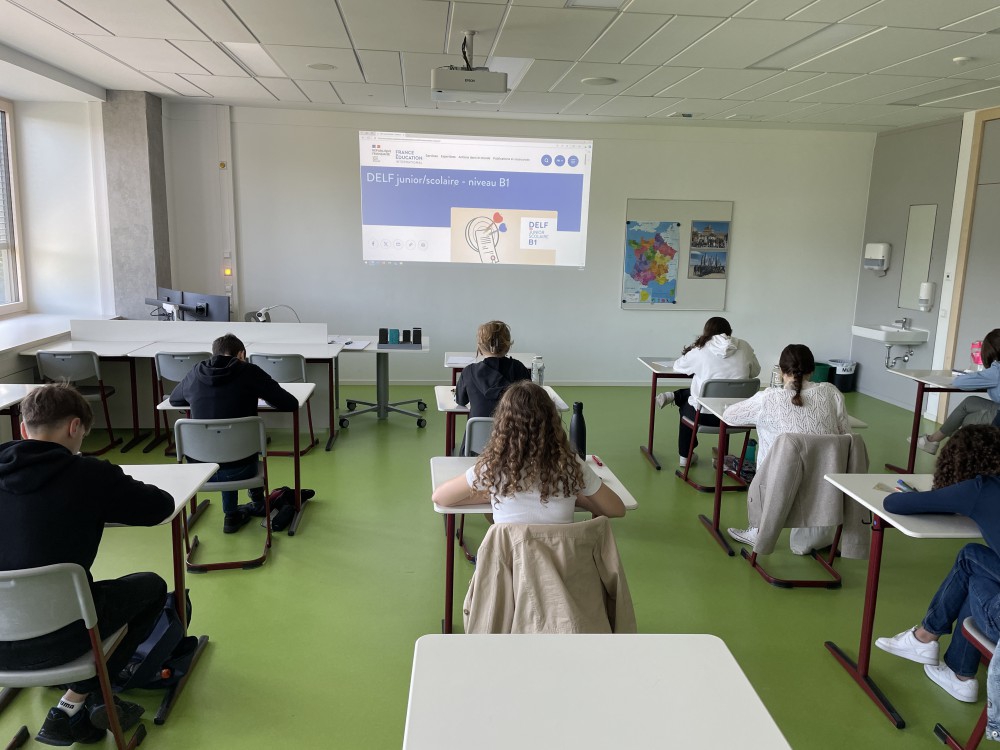 Bereits im Vorfeld hatten die Kandidatinnen und Kandidaten die mündliche Prüfung mit einer Muttersprachlerin absolviert. Die Lektorin des Centre Culturel Français führte die Prüfungen als authentisches Sprachinterview und in Form von Rollenspielen durch – unmittelbar am Vormittag, parallel zum Unterricht. Dieser direkte Kontakt mit einer französischen Gesprächspartnerin macht das DELF scolaire B1 besonders wertvoll: Sprachpraxis auf Augenhöhe, realistisch und lebensnah.