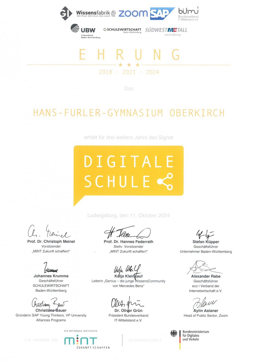 Als eine von 58 Schulen aus Baden-Württemberg erhielt am Freitag das Hans-Furler-Gymnasium den Titel “Digitale Schule”. Die Schulen wurden in den Räumen des Friedrich-Schiller-Gymnasium Ludwigsburgs ausgezeichnet. Als Vertreter des HFG durften Schulleiter Ingo Kruse und Abteilungsleiter Raphael Blessing aus den Händen von Staatssekretärin Sandra Boser MdL (Ministerium für Kultus, Jugend und Sport Baden-Württemberg), Ulrich von Sanden (Schulleiter an der Gastgeber-Schule Friedrich-Schiller-Gymnasium-Ludwigsburg), Stefan Küpper (Geschäftsführer Politik, Bildung und Arbeitsmarkt des Arbeitgeberverbands Südwestmetall), Thomas Sattelberger (Ehrenvorsitzender MINT Zukunft e.V., Mitglied Deutscher Bundestag 2017 – 2022, Parlamentarischer Staatssekretär a.D.), Dr. Diana Knodel (Geschäftsführende Gesellschafterin von fobizz | 101 skills GmbH) sowie Juliane Meister, Wissensfabrik für Deutschland; Stefan Ginthum, Christiani und Benjamin Scherl, Zoom, die Auszeichnung entgegen nehmen, die nun für drei weitere Jahre gültig ist. Einen Überblick über die Standorte der ausgezeichneten Schulen finden Sie unter Schulen in aller Welt – MINT Zukunft schaffen! in einer neu gestalteten virtuellen Landkarte (“Schulen in aller Welt”).
