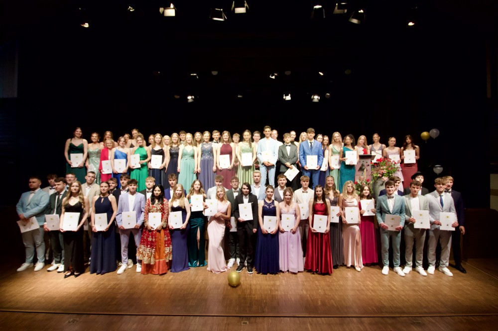 Der feierliche Höhepunkt der Veranstaltung war die Zeugnis- und Preisverleihung. Jeder Abiturient erhielt sein wohlverdientes Abiturzeugnis, begleitet von anerkennenden Worten des Bürgermeisters, Schulleiters und der Tutoren. Die Auszeichnungen und Ehrungen für besondere Leistungen rundeten diesen besonderen Moment ab. Dabei erhielt Marla Katharina Munz den Scheffel-Preis für die beste Deutsch-Leistung, Mia Müller den Otto-Dix-Preis für Bildende Kunst. Dazu konnten sich viele Schülerinnen und Schüler über einen Schulpreis der Sparkasse freuen, der für einen Notenschnitt von 1,5 und besser vergeben wurde.