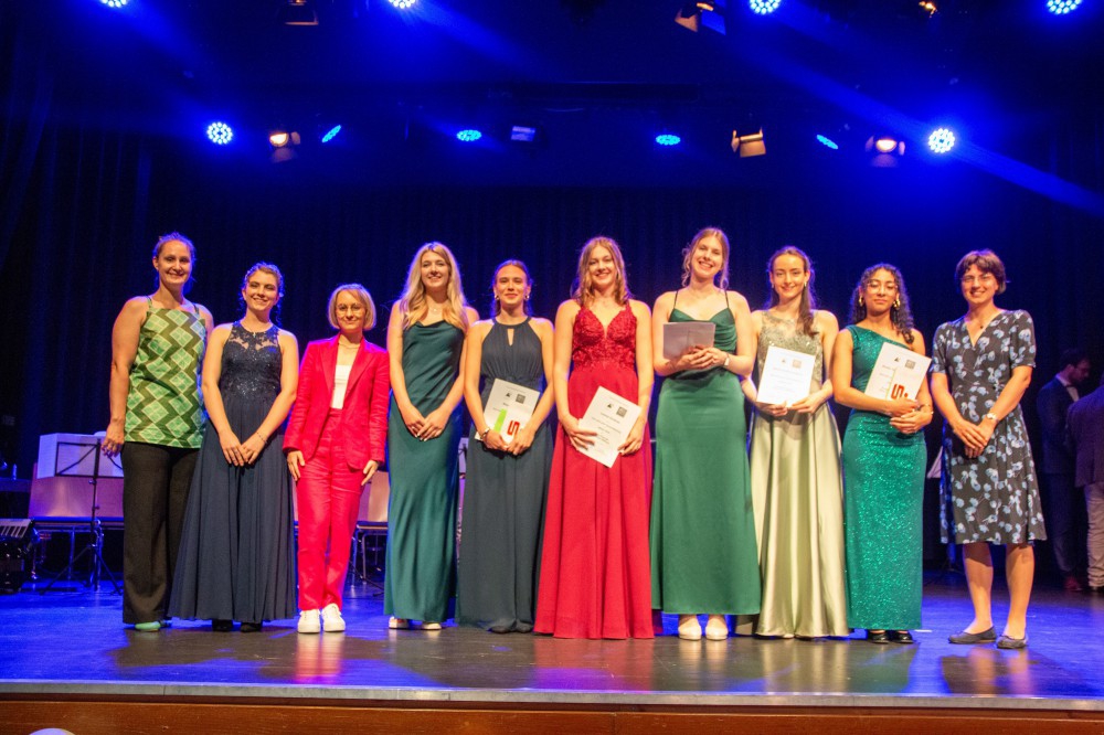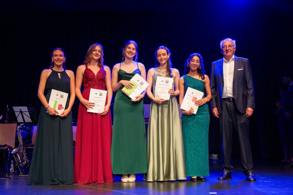Besonders herausragend waren die Leistungen von Emilia Velásquez Correa, Marla Munz, Amelie Rendler, Leonie Schöner und Maja Stanko, die die Traumnote 1,0 erreichten. Zugleich erhielten sie ihren Abibac-Abschluss mit der Auszeichnung „mention Très bien avec Felicitations“ und damit den Europapreis der Furler-Stiftung in Höhe von je 100 Euro. Klaus Furler, der diesen Preis überreichte, gratulierte den fünf Preisträgerinnen zu dieser herausragenden Leistung. Insgesamt erzielten acht Schülerinnen des Jahrgangs mit dem Abibac auch französische Abitur, ein Erfolg, der für die europäische Ausrichtung des Hans-Furler-Gymnasiums spricht. Amelie Rendler erhielt als Jahrgangsbeste den mit 1000 Euro dotierten Preis der Kimmig Entertainment GmbH. Unter großem Applaus wurden die fünf Schülerinnen auf die Bühne gerufen und für ihre außergewöhnlichen Leistungen geehrt. Diese Spitzenleistungen trugen maßgeblich zum hervorragenden Gesamtschnitt des Jahrgangs von 2,0 bei.