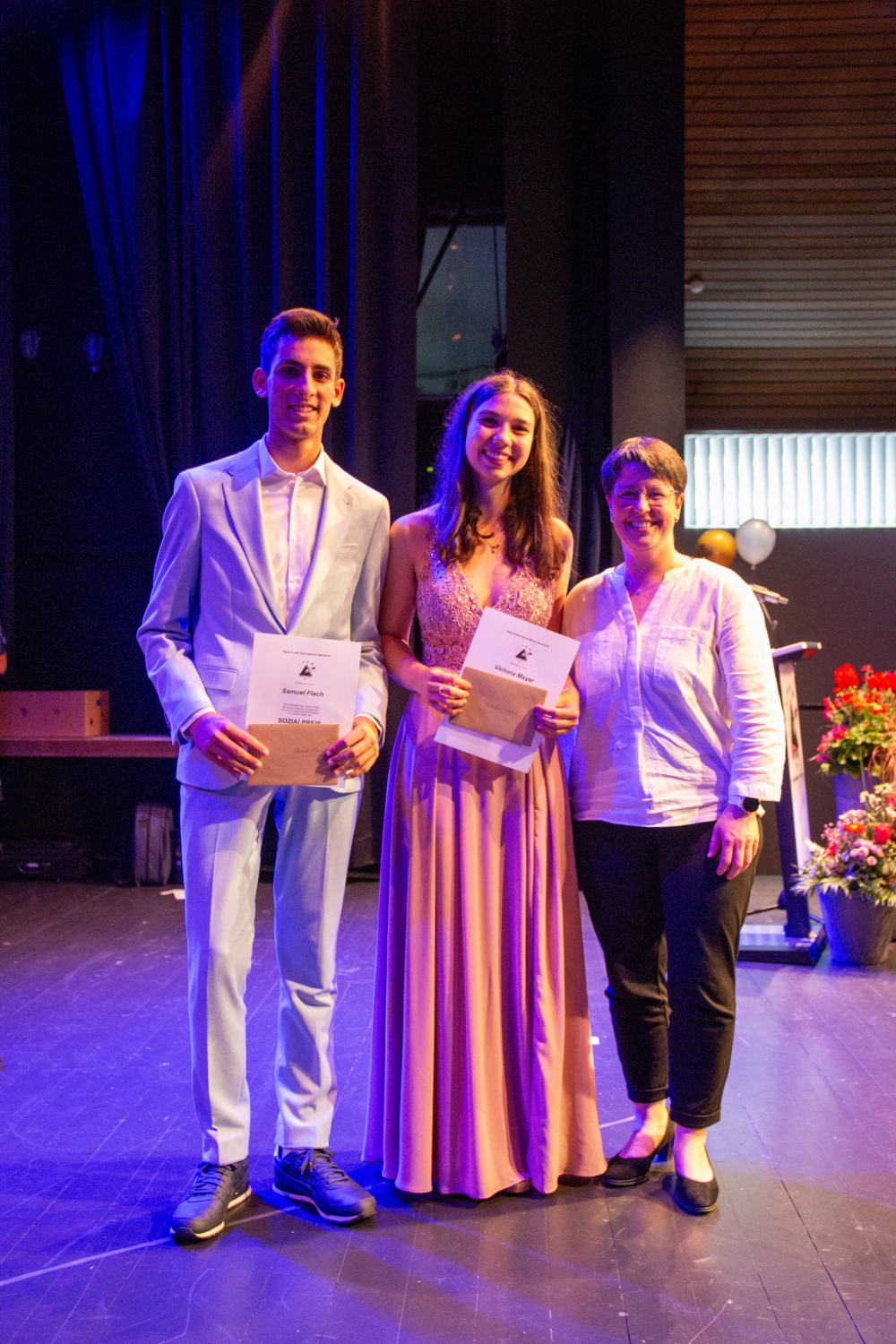 Elternbeiratsvorsitzende Nadja Schmiederer zeichnete Victoria Mayer und Samuel Flach mit dem Sozialpreis aus und ehrte damit die vielfältigen Talente und das Engagement über den akademischen Bereich hinaus.
