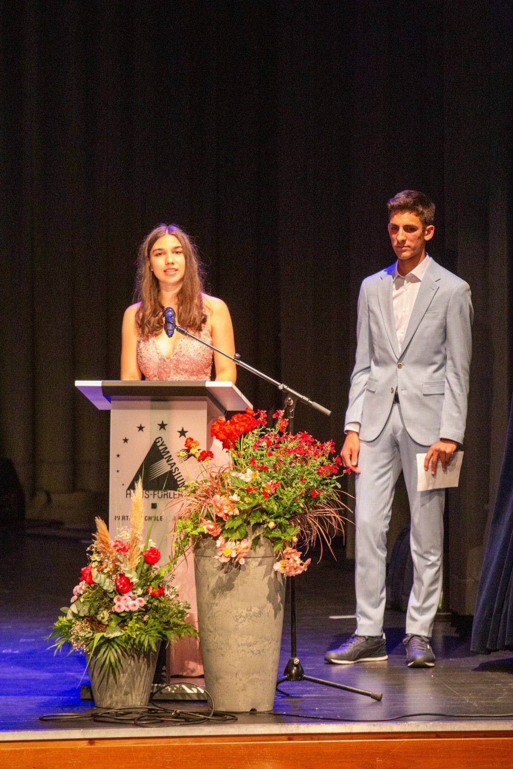 Ein weiterer Höhepunkt des Abends war die Abi-Rede, gehalten von Victoria Mayer und Samuel Flach. In ihrem bewegenden Vortrag ließen sie die Stationen ihrer Schullaufbahn Revue passieren und stellten mit ihren humorvollen und nachdenklichen Anekdoten, die gemeinsame Schulzeit lebendig dar. Sie erzählten, wie sie als Fünftklässler mit ihren vom Freundeskreis geschenkten übergroßen HFG-Shirts, die ihnen bis zu den Knien reichten, in die große neue Schule kamen. In bester Erinnerung blieb auch das Skilandschulheim in Melchsee-Frutt in Klasse 7. „Wir haben dort sprichwörtlich gelernt, auf unseren Beinen zu stehen und sind an uns gewachsen.“, erinnerte sich Samuel Flach. Aber auch die Corona-Jahre mit Fernunterricht in der Mittelstufe kamen zur Sprache. Victoria Mayer erinnerte an die Herausforderungen und die Anpassungen, die sie und ihre Mitschüler bewältigen mussten. Die Studienfahrt in der 11. Klasse war ein „Highlight“ der Schulzeit, die die Stufe „zusammenschweißte“, so Mayer in ihren Ausführungen. Zum Abschluss ihrer Rede dankten die beiden den Eltern, Lehrern und Mitschülern, die sie auf ihrem Weg begleitet haben.