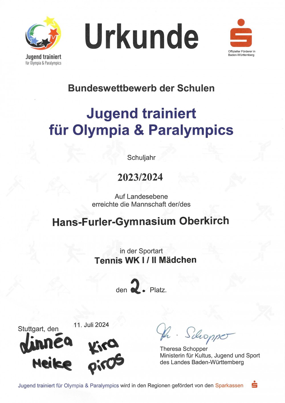 Nach souveränen Siegen auf Regionalebene stand das U18 Mädchenteam des Hans-Furler-Gymnasiums Oberkirch in Singen am Hohentwiel im Halbfinale des Landesentscheids Tennis Jugend trainiert. Auch hier wurde der Gegner, ein Team aus Baden-Baden, mit 5:1 deutlich bezwungen. Damit sicherte sich die Oberkircher Equipe den gesamtbadischen Meistertitel. Im großen Landesfinale war trotz guter Gegenwehr dann das Gymnasium Stuttgart-Degerloch nicht zu bezwingen. Am Ende also Platz 2 und damit Landesvizemeister. Es spielten für das HFG: Piros Becker, Kira Treyer, Linnéa Romier und Meike Treyer.