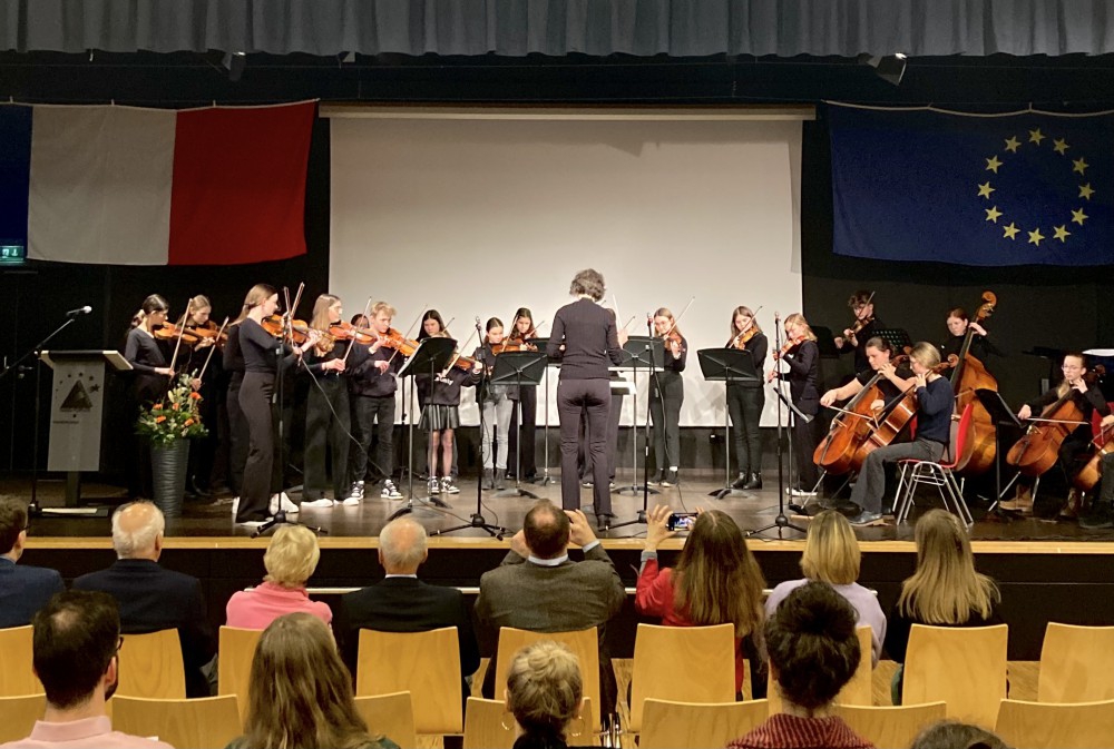 Musikalisch umrahmt wurde die Feier von einem Chor aus Unterstufenchor und Schülern des aktuellen AbiBac-Jahrgangs 2, der Mitwirkung des Schulorchesters und einem beeindruckenden Solo im Musette-Stil der Akkordeonistin und Oberstufenschülerin Céline Müller.