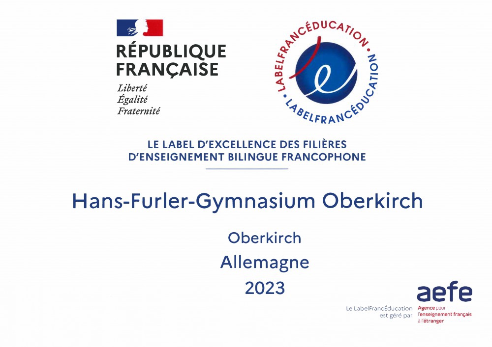 Große Ehre für das Gymnasium in Oberkirch. Die französische Regierung verlieh der Schule das Qualitätslabel FrancEducationLabel für herausragende Arbeit im Bereich des Französischunterrichts. Die Schulleitung des Hans-Furler-Gymnasiums um Schulleiter Ingo Kruse und dessen Stellvertreter Volker Wacker nahm die Auszeichnung im Rahmen einer Feierstunde im Oberdorfer Forum aus den Händen des französischen Generalkonsuls Gaël de Maisonneuve und der Kooperationsattaché des Institut Français Stuttgart, Joëlle Hecker, entgegen.