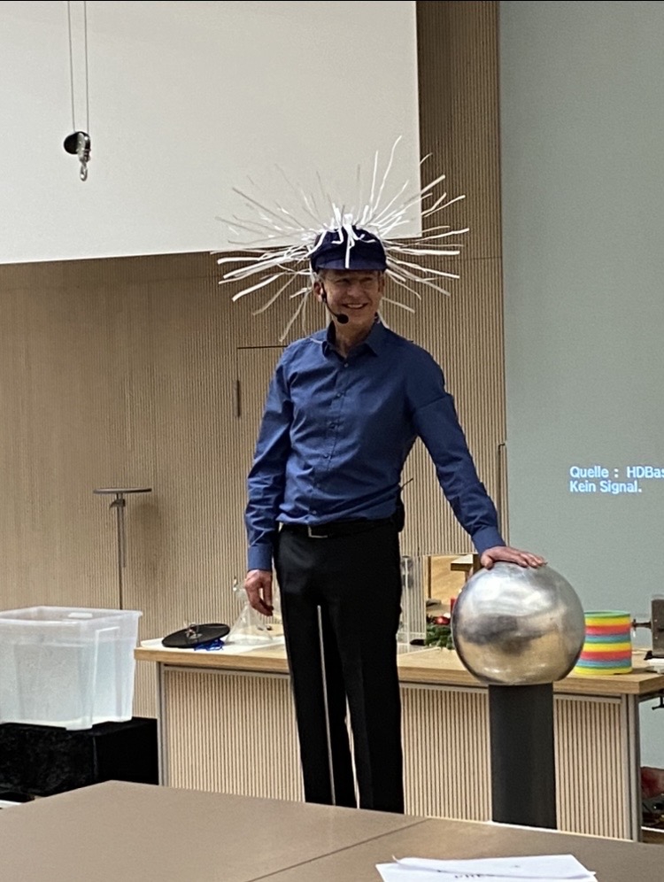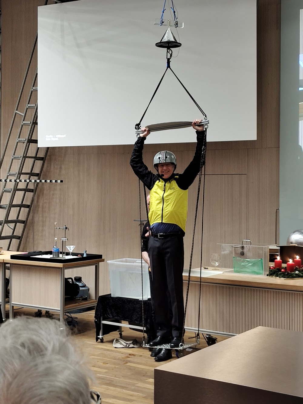 Nach diesen lehrreichen, aber auch amüsanten, Elementen des Tages begann am frühen Abend das Highlight des Tages: Die legendäre Weihnachtsvorlesung von Prof. Dr. Horst Fischer. Schnell wurde klar, weshalb diese Lehrveranstaltung über eine derartige Beliebtheit verfügt. Denn nicht nur war die technische Organisation und Struktur völlig frei von Mängeln, sondern auch die vielen anschaulichen Experimente boten zu keinem Zeitpunkt einen Anlass für Langeweile. So konnten Zuschauer jeder Altersgruppe für die Naturwissenschaften begeistert werden. Den kleinsten Besucherinnen und Besuchern bot sich unter anderem die Möglichkeit die Welt aus dem Inneren einer Seifenblase zu betrachten. Die Weihnachtsvorlesung ist somit für jeden empfehlenswert, der sich gerne von den Gesetze der Physik in den Bann ziehen lässt oder auf unterhaltsame Weise gerne neues und spannendes Wissen aneignen möchte.