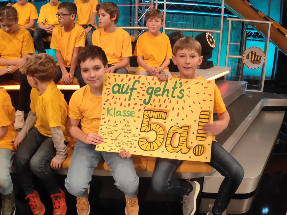 Nach der gespannten Zeit war es am Donnerstag, den 14.12. dann so weit. Die Sendung wurde in Baden-Baden beim SWR aufgezeichnet. Die Klasse wurde dem Team der Tigerenten zugeteilt. Zuvor hatte sich die Klasse schon auf drei Spielkinder Rüya, Zain und Joshua festgelegt, die dann gelb-bedruckte Shirts bekamen, die sie auch als Erinnerung behalten durften.