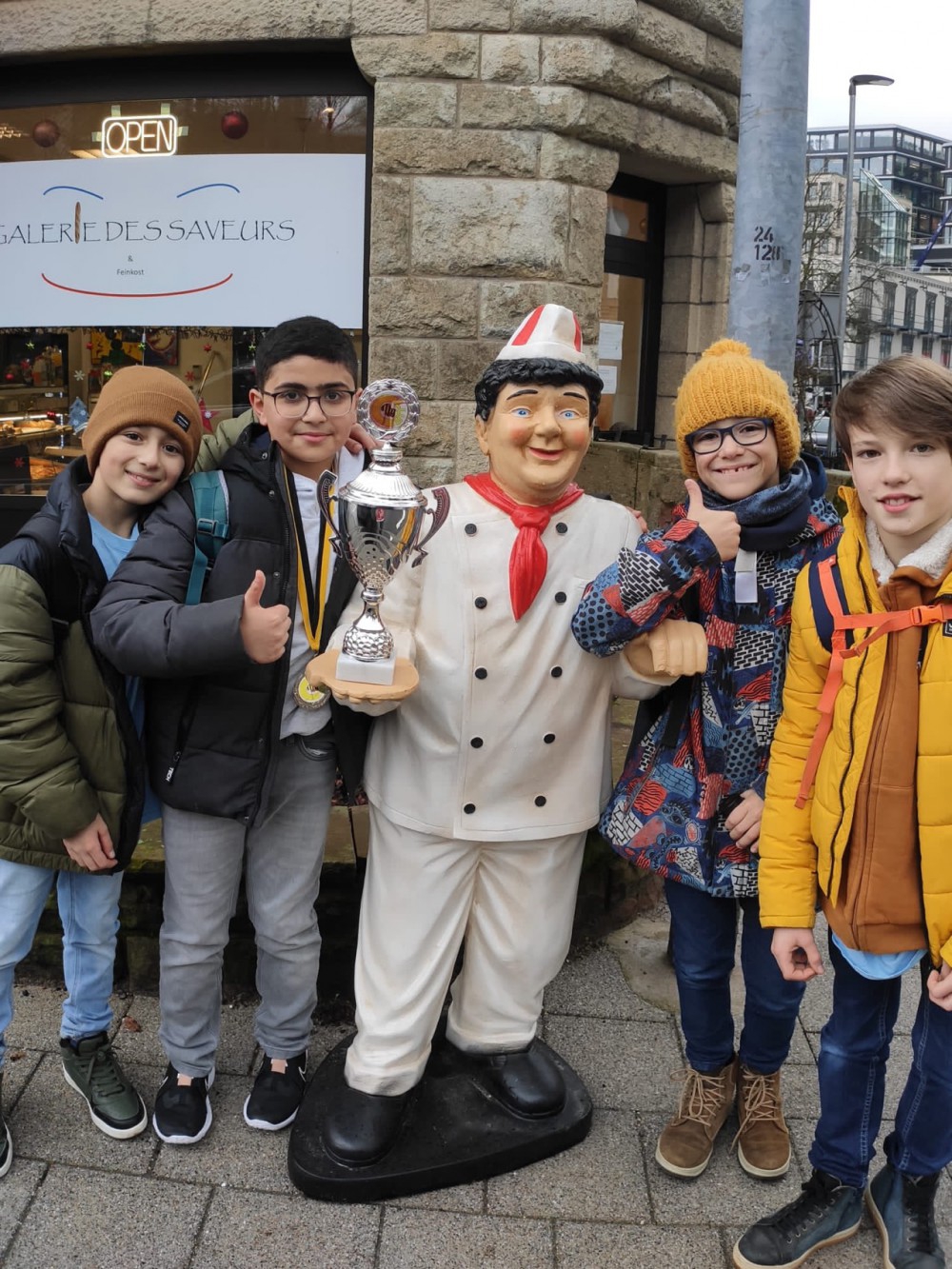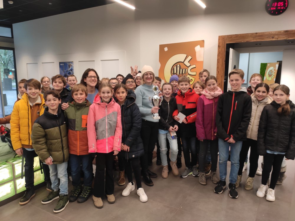 Am Ende gewann die gegnerische Mannschaft der Frösche, eine Klasse aus Gernsbach, ganz knapp. Dennoch gab es einen silbernen Pokal und Frau Vogt-Ehmann bekam als Strafe eine Schleimdusche. Natürlich bekamen alle Kinder auch noch Autogrammkarten der Moderatoren Johannes und Laura.