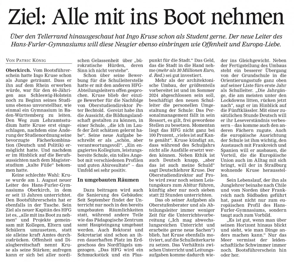 ARZ stellt in der Ausgabe vom 11. September 2023 Oberstudiendirektor Ingo Kruse als neuen Schulleiter des HFG vor.