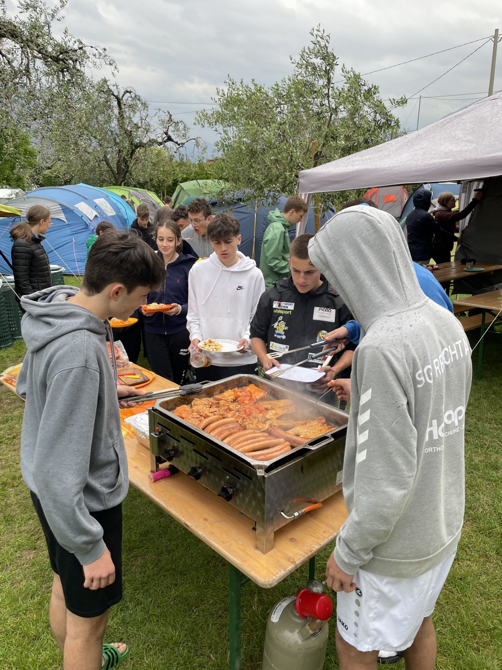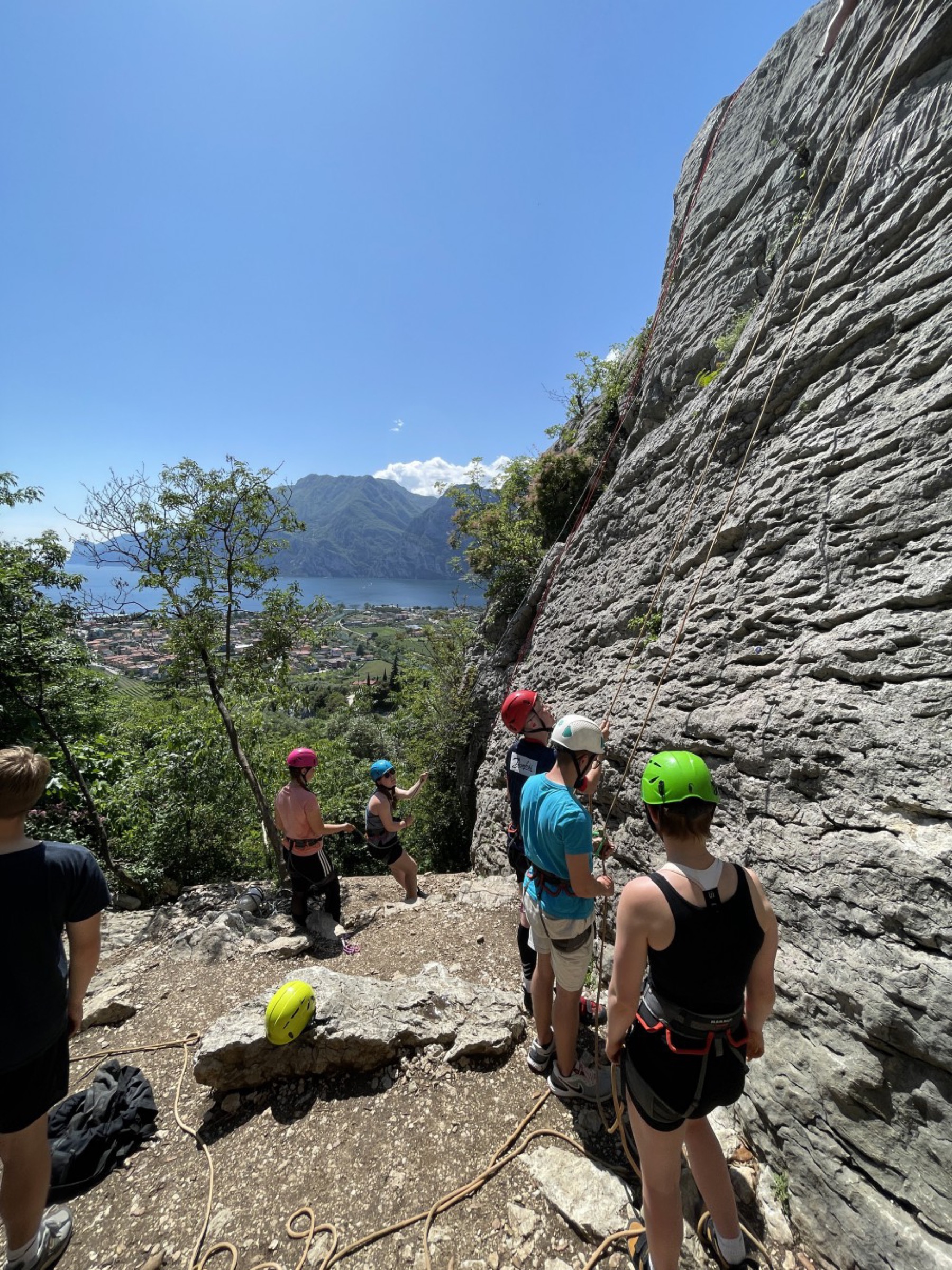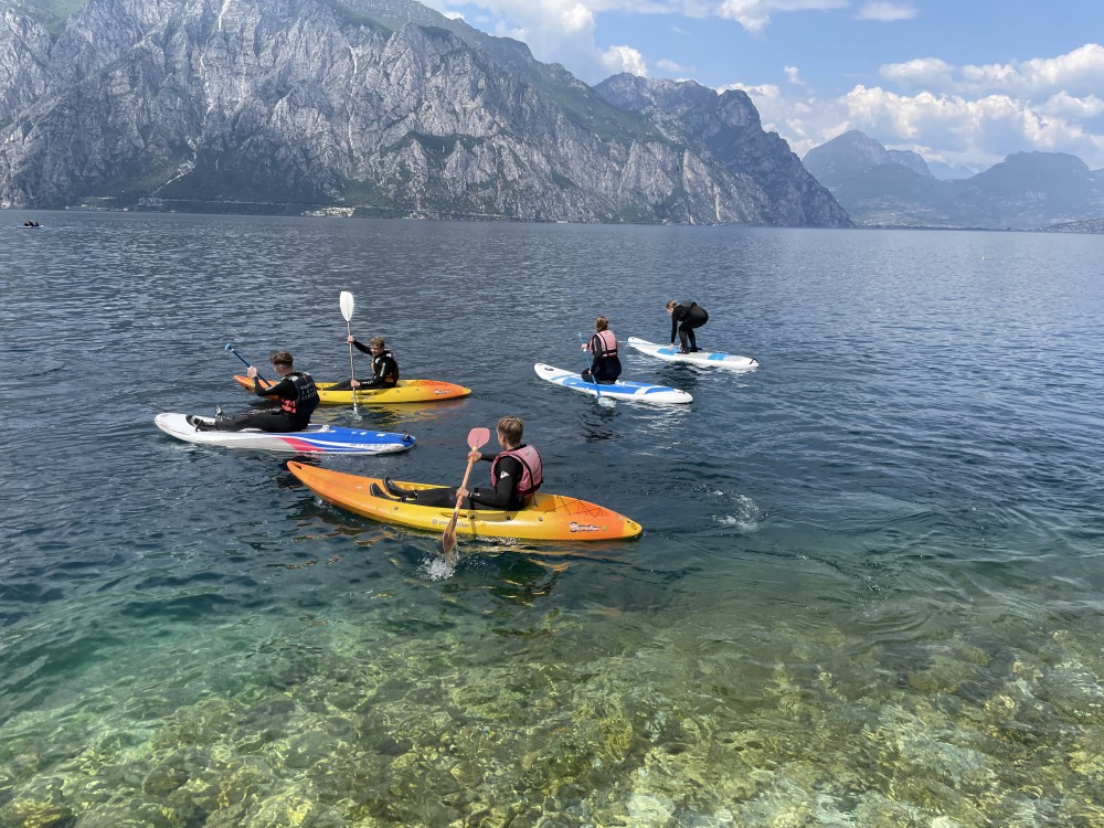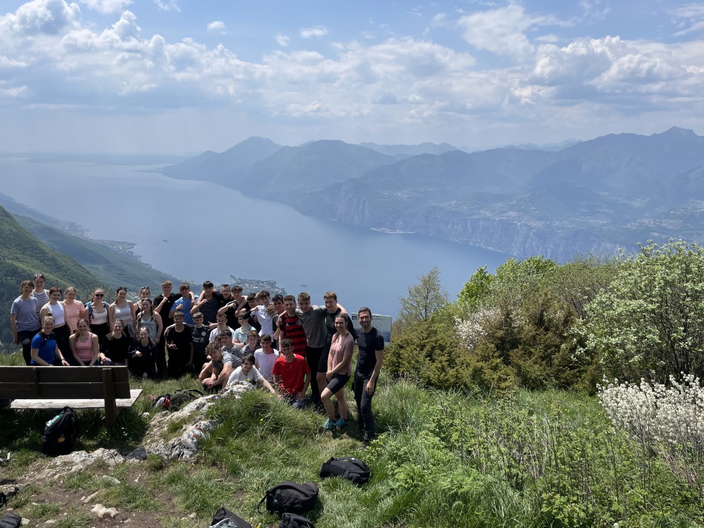 Für alle sportlich engagierten Schülerinnen und Schüler der Jahrgangsstufe 1 startete in der Woche vor den Pfingstferien am Bushäuschen der Schule eine erlebnisreiche Woche, begleitet durch die Lehrkräfte Natalie Dierle, Raphael Blessing, Daniel Kehret und Norman Dold. Nach einer langen Busfahrt hieß es zunächst bei durchwachsenem Wetter den Lagerplatz aufzuschlagen und dem sechstägigen Sportprogramm stand nichts mehr im Wege. Gleich zu Beginn konnten erste Eindrücke zur idyllischen Landschaft und der italienischen Kultur gesammelt werden. Die kommenden Tage waren geprägt von sportlichen Aktivitäten wie dem Ersteigen des Monte Baldo, wofür ehr als 1700 Höhenmeter überwunden wurden. Auch beim Klettern durften sich die Schüler steilen Berghängen stellen und beeindruckende Aussichten ins Tal und auf den See genießen. Der Gardasee wurde natürlich nicht nur betrachtet, sondern auch in einem zweitägigen Windsurfkurs sowie mit Kajaks und Stand Up Paddle Boards erkundet. Dabei galt höchste Konzentration, um den Einflüssen von Wind und Strömung die Stirn zu bieten. Der absolute Endgegner für die meisten zeigte sich jedoch in einer anspruchsvollen Mountainbiketour, welche viel Schweiß und Durchhaltevermögen abverlangte. Nach anstrengendem Sportprogramm war eine sehr gute Selbstverpflegung, umgesetzt durch Kochgruppen, eine tolle Abrundung am Abend. Natürlich kam neben dem Pflichtprogramm die Freizeit auch nicht zu kurz. Spannende Spikeball- und Volleyballmatches sowie Ausflüge in die Stadt und in heißbegehrte Pizzerien, verliehen dem ganzen eine Art besonderes Feeling und sorgten für eine gute Stimmung innerhalb der Gruppe. Jedem war viel Abwechslung geboten und man kann auf viele schöne, kollegiale Abende zurückblicken. Auch ein Unwetter, welches einige Zelte und Pavillons zum Opfer brachte, konnte die Gruppe nicht aus der Ruhe bringen. Nach einer erlebnisreichen Studienfahrt hieß es jedoch dann wieder Abschied zu nehmen. Die Rückfahrt war geprägt von unterhaltsamen DJ Skills einer der begleitenden Lehrkräfte sowie guter Laune und Vorfreude auf die Heimat und vor allem darauf, nicht mehr auf dem harten Zeltboden schlafen zu müssen. Die Reise endete wieder am Bushäuschen des HFG, wobei alle auf eine sehr ereignisreiche und tolle Woche zurückblicken dürfen.