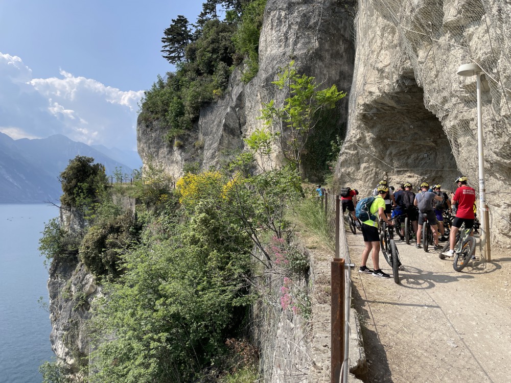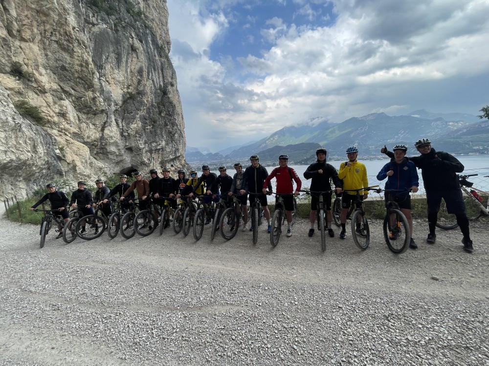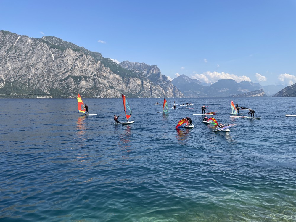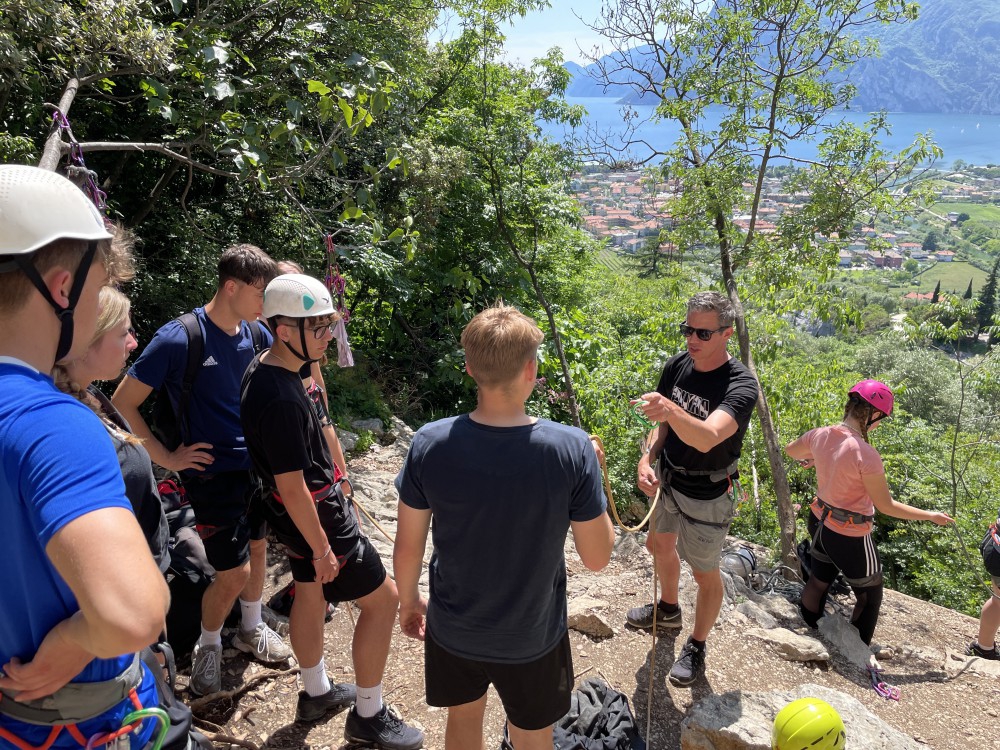 Für alle sportlich engagierten Schülerinnen und Schüler der Jahrgangsstufe 1 startete in der Woche vor den Pfingstferien am Bushäuschen der Schule eine erlebnisreiche Woche, begleitet durch die Lehrkräfte Natalie Dierle, Raphael Blessing, Daniel Kehret und Norman Dold. Nach einer langen Busfahrt hieß es zunächst bei durchwachsenem Wetter den Lagerplatz aufzuschlagen und dem sechstägigen Sportprogramm stand nichts mehr im Wege. Gleich zu Beginn konnten erste Eindrücke zur idyllischen Landschaft und der italienischen Kultur gesammelt werden. Die kommenden Tage waren geprägt von sportlichen Aktivitäten wie dem Ersteigen des Monte Baldo, wofür ehr als 1700 Höhenmeter überwunden wurden. Auch beim Klettern durften sich die Schüler steilen Berghängen stellen und beeindruckende Aussichten ins Tal und auf den See genießen. Der Gardasee wurde natürlich nicht nur betrachtet, sondern auch in einem zweitägigen Windsurfkurs sowie mit Kajaks und Stand Up Paddle Boards erkundet. Dabei galt höchste Konzentration, um den Einflüssen von Wind und Strömung die Stirn zu bieten. Der absolute Endgegner für die meisten zeigte sich jedoch in einer anspruchsvollen Mountainbiketour, welche viel Schweiß und Durchhaltevermögen abverlangte. Nach anstrengendem Sportprogramm war eine sehr gute Selbstverpflegung, umgesetzt durch Kochgruppen, eine tolle Abrundung am Abend. Natürlich kam neben dem Pflichtprogramm die Freizeit auch nicht zu kurz. Spannende Spikeball- und Volleyballmatches sowie Ausflüge in die Stadt und in heißbegehrte Pizzerien, verliehen dem ganzen eine Art besonderes Feeling und sorgten für eine gute Stimmung innerhalb der Gruppe. Jedem war viel Abwechslung geboten und man kann auf viele schöne, kollegiale Abende zurückblicken. Auch ein Unwetter, welches einige Zelte und Pavillons zum Opfer brachte, konnte die Gruppe nicht aus der Ruhe bringen. Nach einer erlebnisreichen Studienfahrt hieß es jedoch dann wieder Abschied zu nehmen. Die Rückfahrt war geprägt von unterhaltsamen DJ Skills einer der begleitenden Lehrkräfte sowie guter Laune und Vorfreude auf die Heimat und vor allem darauf, nicht mehr auf dem harten Zeltboden schlafen zu müssen. Die Reise endete wieder am Bushäuschen des HFG, wobei alle auf eine sehr ereignisreiche und tolle Woche zurückblicken dürfen.