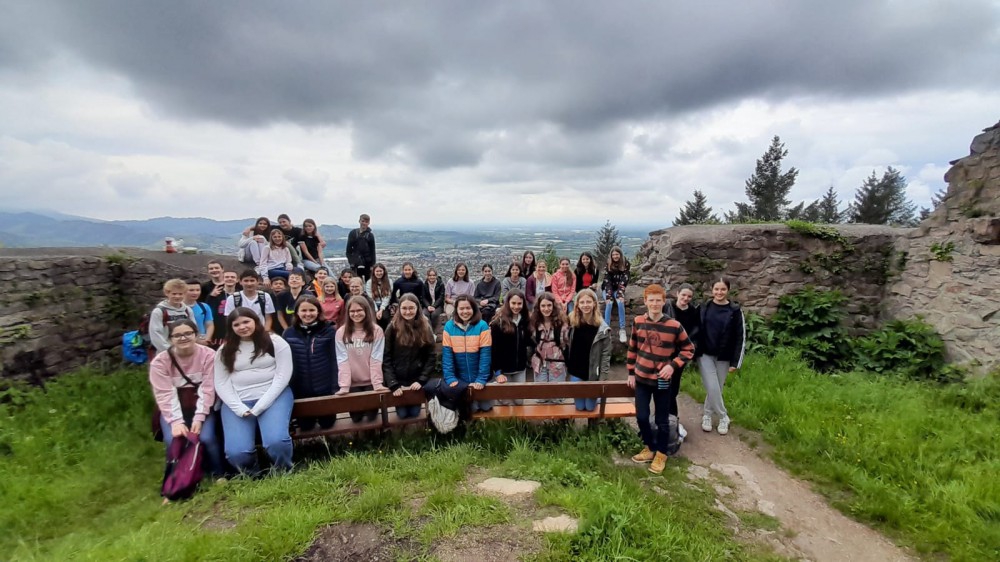 Nachdem die deutschen Schülerinnen und Schüler im Oktober 2022 das Wochenende, von Freitag bis Montag, bei den französischen Austauschpartnerinnen und -partnern im elsässischen Gerstheim verbracht hatten, kam es vom 12. bis 15. Mai 2023 zum Gegenbesuch in Oberkirch. Am Freitagmorgen traf die französische Gruppe ein und in der Mensa des HFG wurden erst ein paar Kennlernspiele gespielt, bei denen man sowohl deutsche als auch französische Stars erkennen musste. Danach ging es in die Innenstadt von Oberkirch zu einer kleinen Rallye, wo vielerlei lustige und kreative Fotos und Videos zustande kamen und die französischen Schülerinnen und Schüler Oberkirch besser kennenlernten. Allerdings zeigte sich Oberkirch wettertechnisch nicht von seiner sonnigsten Seite. Unter Leitung von Silja Minet-Lasch und Timm Düsterhöft sowie zwei französischen Lehrerinnen wanderte die Gruppe dann auf die Schauenburg, wo eine kleine Pause eingelegt wurde. Über den Schwalbenstein ging es dann zurück zum HFG. Das Wochenende verbrachte die französischen Schülerinnen und Schüler dann bei ihren Austauschpartnern, die sich selbst ein Programm dafür überlegt hatten und es frei gestalten durften. Am Montag besuchten die französischen Gäste den Unterricht von der ersten bis zur sechsten Schulstunde. Danach wurde zusammen in der Mensa gegessen, bevor dann unter Leitung von Simone Bramert und Matthias Cleiß gemeinschaftliche und sportliche Spiele auf dem Programm standen. Am Ende ging es für Franzosen wieder zurück in die Heimat. <