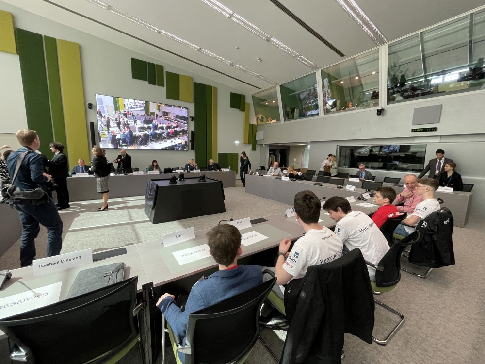 Die Schüler Linus Huber, Marcus Maier, Paul Federau (HFG-BotS), Mick Weber und Leon Eckardt (HFG Robokirch), sowie ihre beiden Coaches Raphael Blessing und Henning Scheid folgten einer Einladung der Europarat-Ausschüsse für künstliche Intelligenz, Bildung und Kinder und durften an deren gemeinsamer Sitzung teilnehmen.