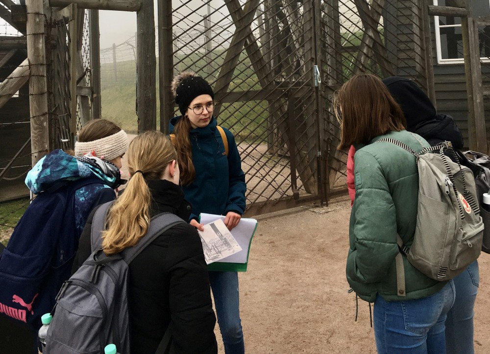 Nebel, kalter Wind und vereinzelte Schauer hielten die 15 Elftklässlerinnen nicht davon ab, ihre Gruppen mit verschiedenen Methoden und Materialien bis zu fünf Stunden lang durch das Gedenkstättengelände zu lotsen und die bewegende Geschichte des Ortes den Jugendlichen altersgerecht näherzubringen. Fünf Geschichtslehrkräfte des HFG bewerteten die intensiv vorbereiteten Führungen der Schülerguides an unterschiedlichen Stationen. Die 80 Schülerinnen und Schüler der neunten Klasse lauschten gespannt in kleinen Gruppen ihrem Guide, wurden mit Schicksalen, Zitaten, Bildern und Gegenständen aus der Zeit am „authentischen“ Ort konfrontiert, stellten viele Fragen und sind mit zahlreichen Eindrücken und Impulsen zum Nachdenken heimgekehrt.