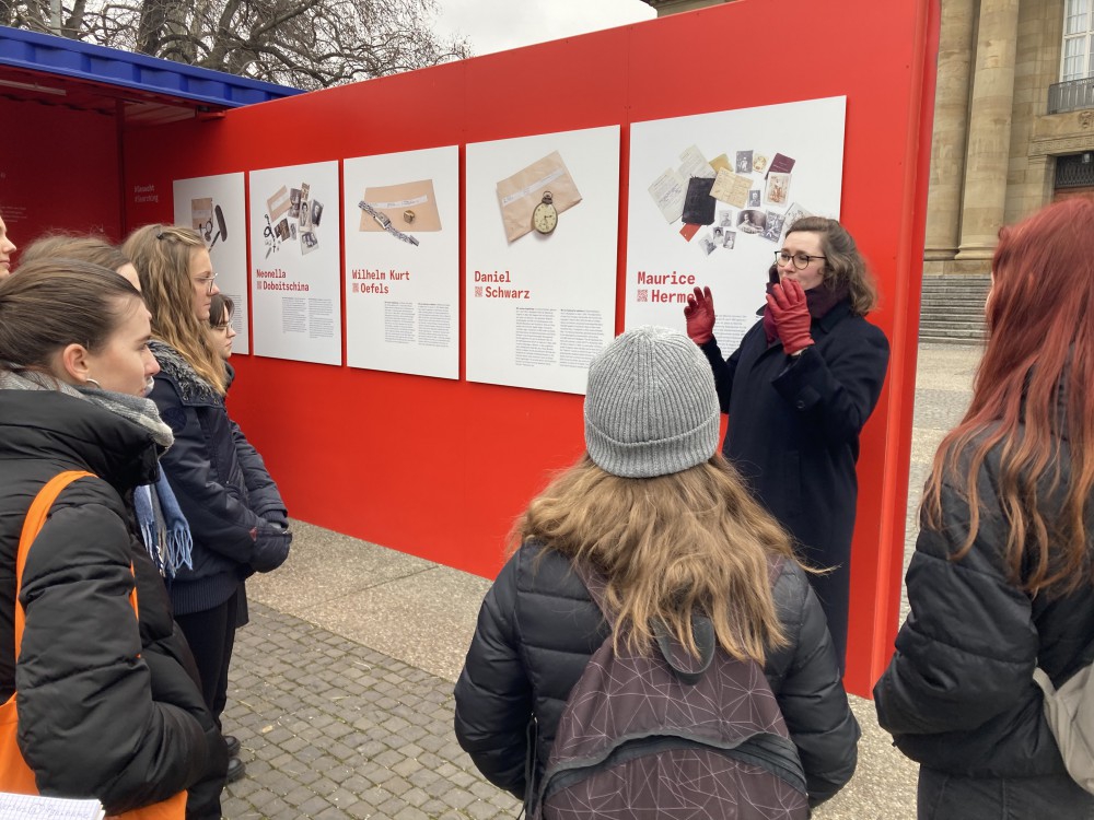 Den Abschluss machte ein Schülerprojekt des Zentrums für Gestaltung Ulm, bei dem Absolventen eines Kurses für Grafikdesign bekannte Zitate von Widerständlern grafisch umgesetzt haben. Die musikalische Rahmen wurde von einem iranischen Ensemble gesetzt, das den aktuellen Widerstand iranischer Frauen lyrisch vertonte. Im Anschluss an die Feier bekamen unsere Schülerinnen nach einer Stärkung im Foyer des Landtages noch eine persönliche Einführung in die Arbeit der Arolsen Archives, die es sich zur Aufgabe gemacht haben, sogenannte Effekten, also persönliche Gegenstände, die KZ-Häftlinge abgenommen bekamen, an die Nachfahren und Verwandten zurückzugeben. Die dazu gehörige Wanderausstellung #StolenMemory macht derzeit auch in Stuttgart Halt.