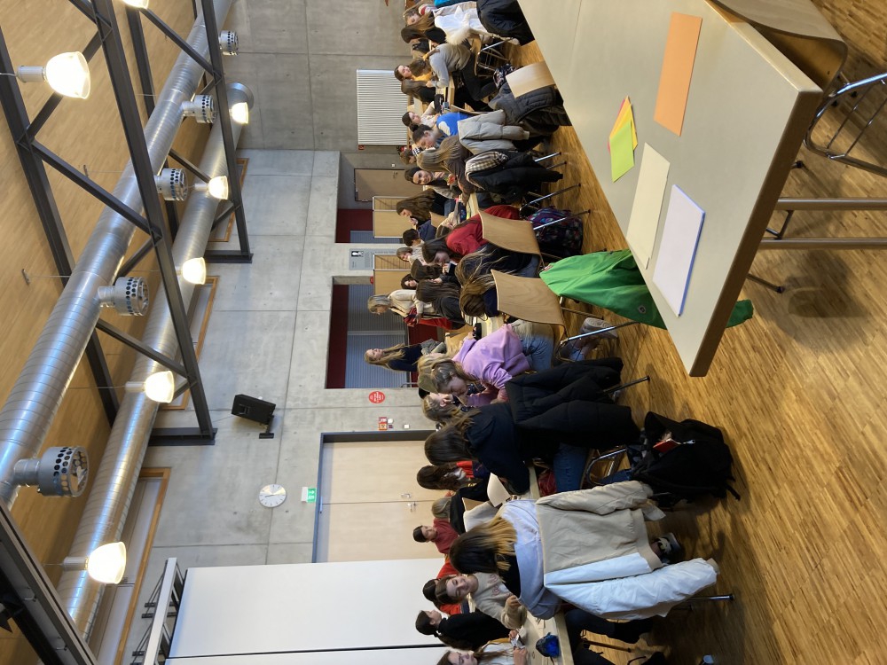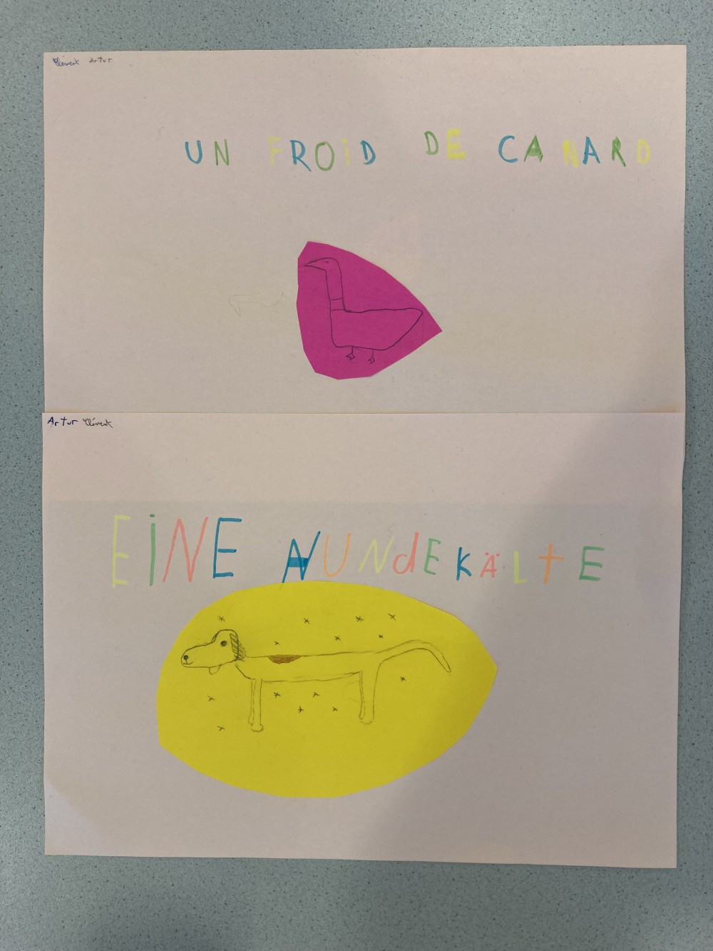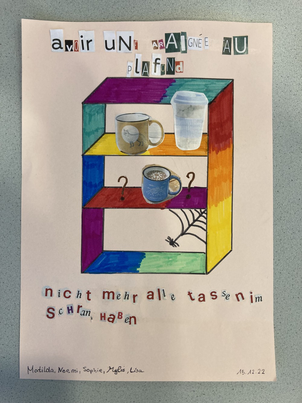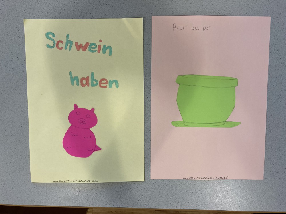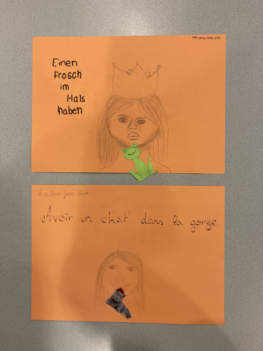 Alle waren sehr gespannt, sich nach dem Austausch erster Briefe nun in Wirklichkeit zu treffen. Nach der Ankunft der französischen corres aus Lingolsheim wurden deutsch-französische Interviews geführt, um sich gegenseitig besser kennenzulernen. Auch ein Quiz über das HFG wurde in deutsch-französischen Gruppen gelöst, um den deutschen und französischen Schulalltag vergleichen zu können. Das gemeinsam gesungene Aux Champs-Elysées bot eine musikalische Abwechslung, bevor schließlich deutsche und französische Sprichwörter einander gegenübergestellt und illustriert wurden: Während wir beispielsweise einen Frosch im Hals haben, ist es in Frankreich un chat dans la gorge.
