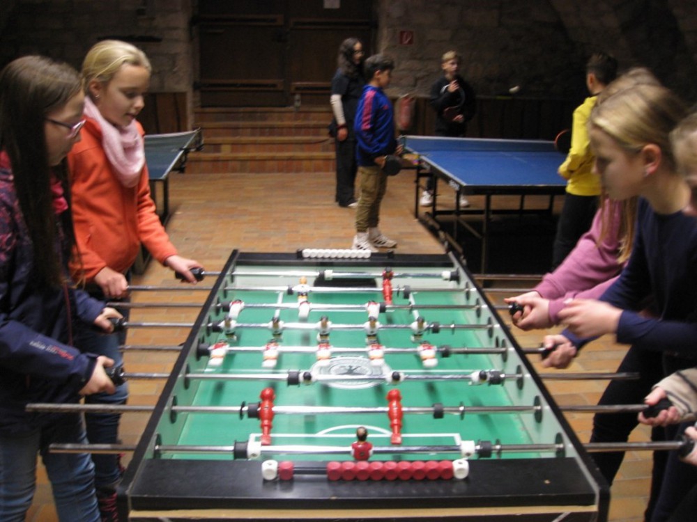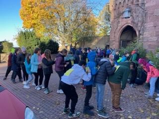 Es fing alles am Montagmorgen, den 21.11.2022 an. Wir trafen uns um 8 Uhr am Bushäuschen, von welchem wir dann zum Oberkircher Bahnhof liefen. Dort warteten wir auf unseren Zug, der wenig später auch eintraf. Nach einer Weile stiegen wir in Gengenbach aus und besuchten erst einmal den nicht weit weg liegenden Spielplatz. Dort hatten wir eine Stunde Aufenthalt. Wir spielten Fangen und machten Sport an dort stehenden Gymnastikgeräten. Um ca. 11:30 Uhr brachen wir wieder auf und wanderten ungefähr 9 Kilometer an der Kinzig entlang rauf zum Schloss. Das war anstrengend! Auf dem Weg legten wir mehrmals Pausen ein, kamen aber schließlich auf Ortenberg an. Als wir endlich da waren, unsere Beine waren ganz schlapp, bezogen wir unsere Betten und richteten unsere Zimmer ein. Danach durften wir bis zum Abendessen um 18:30 Uhr in den Spielekeller oder andere Sachen erledigen. Als wir gegessen hatten, machten wir uns noch einen gemütlichen Spieleabend. Doch irgendwann ging auch der schönste Tag zu Ende und wir fielen alle müde in die Betten.
