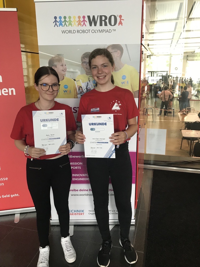 Im Juli nahmen wir, Emely Geiler (14) und Laura Heuberger (13), an unserem ersten Robotik Wettbewerb teil, weshalb wir zunächst das Starterprogramm der World Robot Olympiad (WRO) auswählten. Am Morgen des 09.07.2022 trafen wir uns um 7:30 Uhr mit unserem Coach Herrn Scheid, um uns auf den Weg nach Böblingen zu machen, wo der Wettbewerb stattfinden sollte. Dort hatten wir nochmal einiges an Zeit um weiter an unserem Roboter zu bauen und zu programmieren. Wir schafften in dieser Zeit eine weitere Aufgabe, sowie die Überraschungsaufgabe zu erledigen und waren deshalb sehr früh fertig. Währendessen hatten wir so viele Testläufe wie wir benötigten und insgesamt drei Wertungsläufe, bei denen der Beste zählte. Zwei der Wertungsläufe liefen bei uns nicht sehr gut, aber mit dem dritten Ergebniss waren wir sehr zufrieden. In den Pausen gab es kostenloses Essen für die Teilnehmer und wir konnten den anderen Teams beim Bauen zusehen. Da es leider keine Platzierung gab, haben wir bei der Siegerehrung nur Urkunden bekommen, aber theoretisch wären wir gemeinsam mit einem anderen Team auf dem ersten Platz.Der ganze Wettbewerb hat uns sehr viel Spaß gemacht, auch wenn es manchmal etwas frustrierend war, wenn etwas nicht so funktioniert hat wie man gerne wollte.
