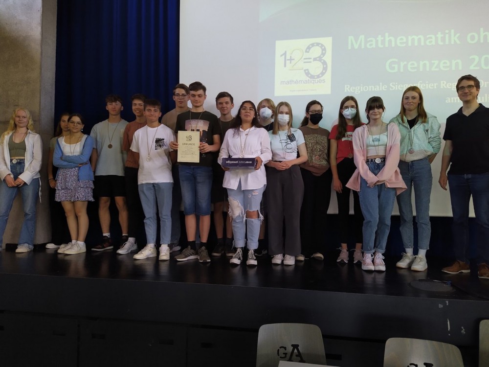 Bei der regionalen Siegesfeier des Wettbewerbs „Mathematik ohne Grenzen“ in der Mensa des Acherner Gymnasiums erkämpften sich zwei Klassen einen Platz auf dem Siegertreppchen. Eingeladen waren die Klassen 9a und 10c vom HFG, sowie weitere Klassen aus der Region. Sie alle waren beim Hauptwettbewerb unter die besten Klassen der Ortenau gekommen. Allein im Bereich des RP Freiburg hatten 141 neunte und 131 zehnte Klassen teilgenommen.