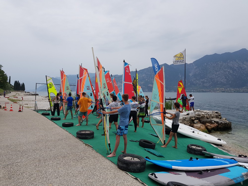 Am nächsten Morgen wurden wir geweckt und es stand Windsurfen auf dem Programm. Wir waren alle richtig begeistert und aufgeregt. Die Vorstellung mit einem Brett und einem Segel über das Wasser zu gleiten war unvorstellbar. Nach ca. einer Stunde hatten alle einen Neoprenanzug, ein Surfbrett mit Segel und eine Einweisung im Gepäck. Es ging los. Nach und nach hat sich der ein oder andere Schüler getraut aufzustehen und einen ersten Versuch zu wagen. Es war zu spüren wie der Wind in das Segel drückte und wie es langsam, aber sicher vorwärts ging. Am Ende des Tages waren wir alle sichtlich erschöpft und wir hatten großen Hunger. Nach dem Essen sind wir wie jeden Tag in den See und sind zur Erfrischung eine Runde geschwommen. Als Abschluss des Tages spielten wir noch ein Volleyballturnier mit den Lehrern. Das war sehr witzig und natürlich gab es auch eine Revanche.