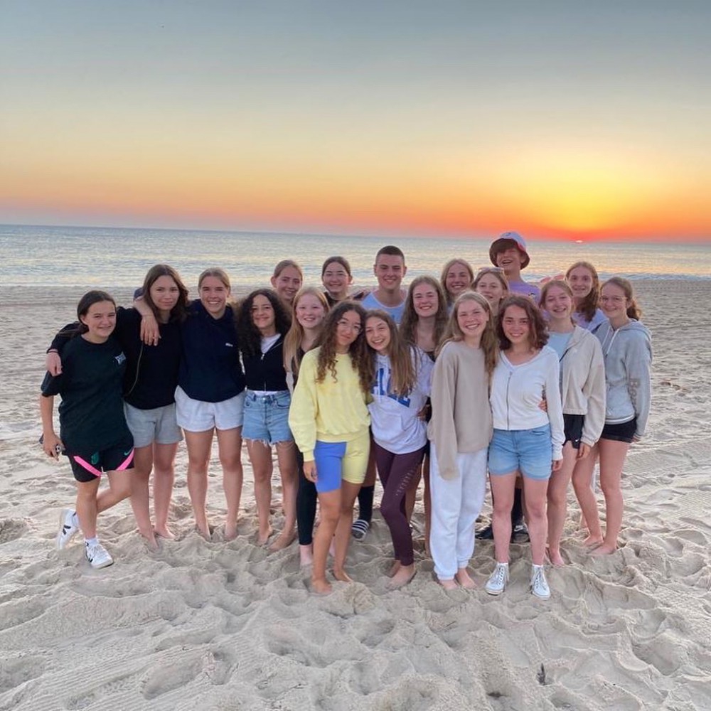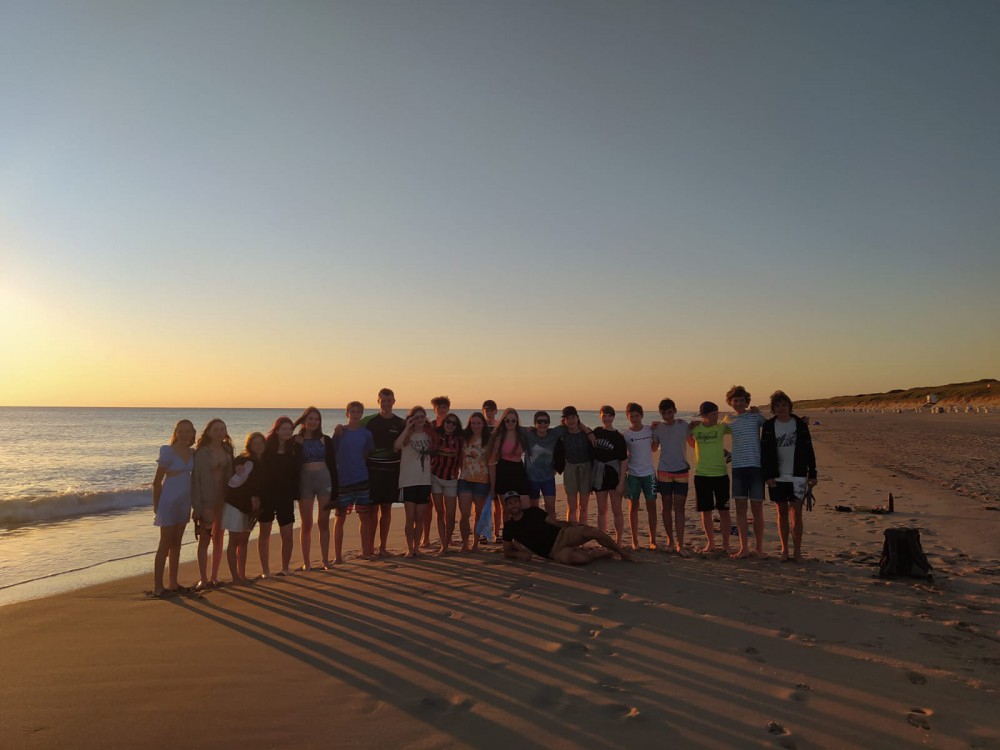 Nach dem Abendessen und ein paar Stunden Freizeit, die aus Musik und Gemeinschaftsspielen bestand, fanden wir uns um 21 Uhr am Strand zusammen. Die 9c spielte ein paar pädagogische Spiele, während die 9b einen Spaziergang in Richtung Sonnenuntergang unternahm. Dort entstanden dann auch die Gruppenbilder, auf denen Herr Dold selbstverständlich auch drauf ist. Schlussendlich setzten wir uns als Klasse zusammen und sahen der Sonne zu, wie sie unter dem Meeresspiegel verschwand und den Himmel in strahlendem Rot zurückließ.