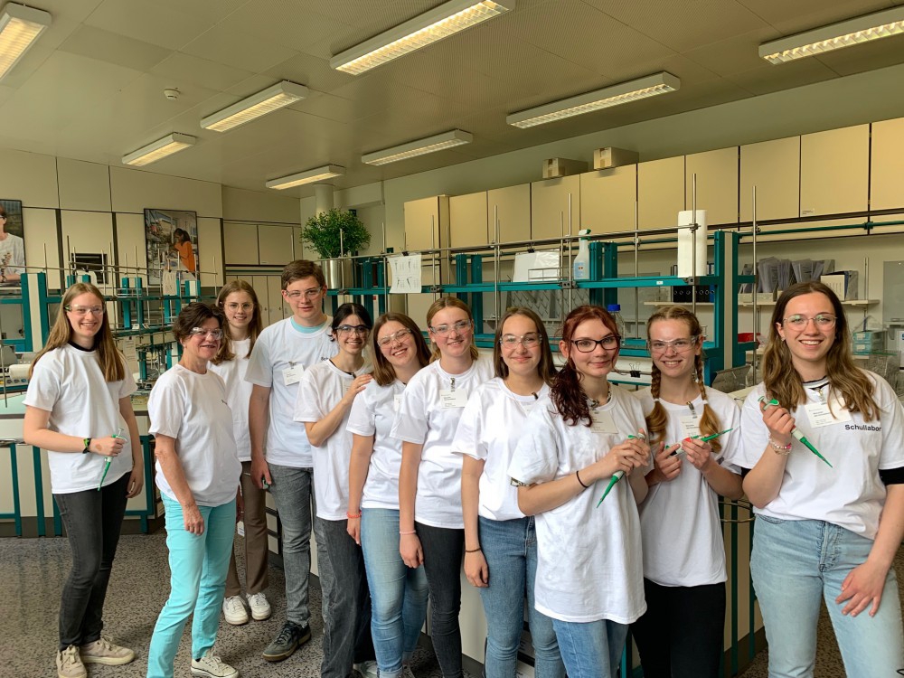 Der zweite Tagespunkt war auf 10 Uhr angesetzt. Dafür mussten wir nun zum Schülerlabor laufen, denn heute sollten wir noch unsere DNA untersuchen. Dort angekommen wurden wir in unser Tagesprojekt eingeweiht. In vier aufeinanderfolgenden Versuchen sollten wir untersuchen, wer von uns zehn Schülern normale Geschmacksrezeptoren für den Geschmack bitter hat oder wer von uns sogar ein sogenannter Supertaster ist und wer von uns eine Mutation hat und somit keine extrem bitteren Stoffe schmecken kann. Der Rezeptor für den Geschmack von Bitterstoffen soll den Menschen schützen, denn die meisten Gifte schmecken bitter, so auch Gifte in Brokkoli oder Rosenkohl. Im Laufe der Versuche haben wir unsere DNA 35 milliardenfach vermehrt. Nachdem unser Erbmaterial dann mehrfach erhitzt, gekühlt und geschleudert wurde, wurde sie zu guter letzt auch noch mithilfe von Restriktionsenzymen (Scheren) in verschieden große Stücke zerschnitten. Anhand dieser Teile, die sich bei der Gelelektrophorese unterschiedlich in einem Wasserbad angeordnet hatten, konnte man feststellen, ob man das mutierte Gen besitzt oder nicht. Schlussendlich haben wir herausgefunden, dass es unter uns zehn 3 Mutanten gibt. Dies hat unsere Vermutung, welche wir vorher durch ein Selbstexperiment mit einem bitteren Gift (weit unter der letalen Dosis) aufgestellt haben, bestätigt.