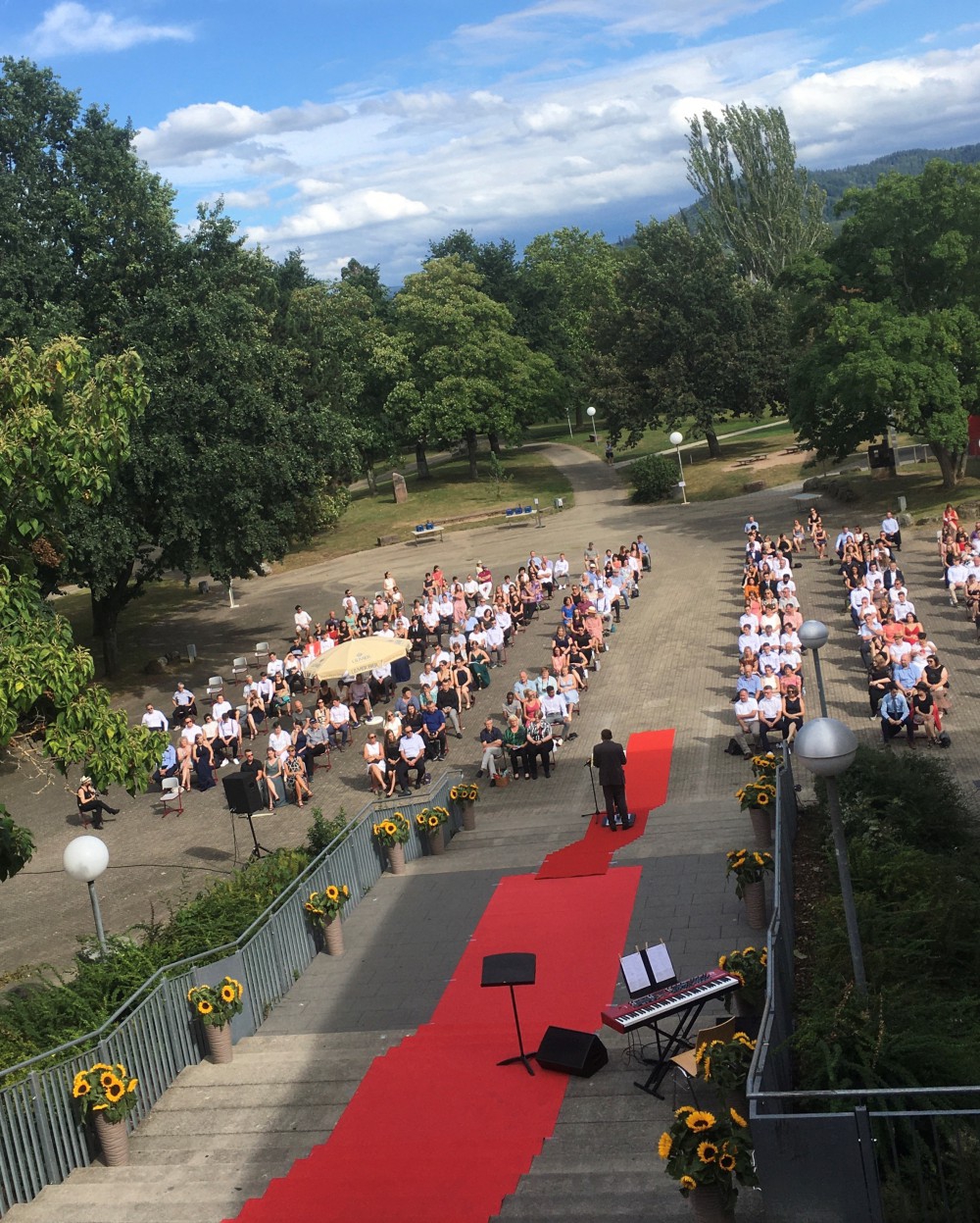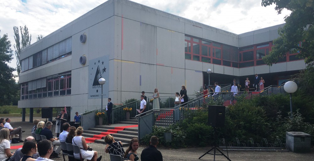 Die Schlussfeier konnte in diesem Jahr nicht in der Aula der Schule durchgeführt werden. Die Bestimmungen infolge der Corona-Pandemie ließen dies nicht zu. Daher wurden erstmalig der große Schulhof und die große Schultreppe - mit rotem Teppich - zur großen Bühne für die Zeugnisübergabe.