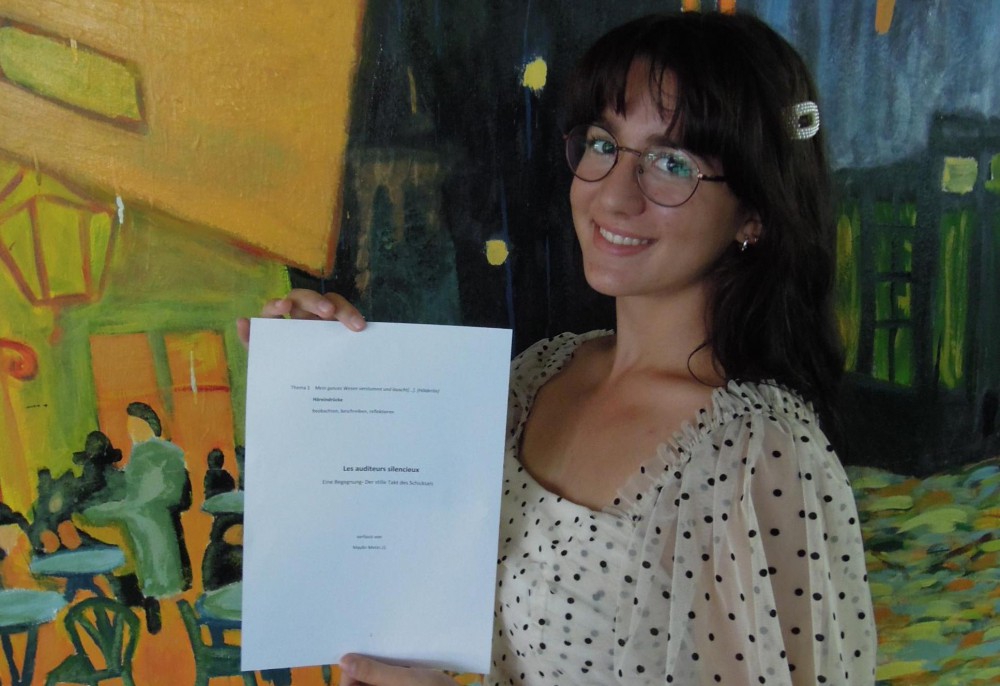 Die Aufgabe, die Maylin gewählt hat, bezog sich auf ein Zitat von Hölderlin: „Mein ganzes Wesen verstummt und lauscht[...]. Dazu galt es, Höreindrücke zu beobachten, zu beschreiben und darüber zu reflektieren – eine anspruchsvolle Aufgabe. Maylins Text spielt in Paris, einer Stadt, die sie liebt und ein-, zweimal im Jahr besucht. Deshalb trägt ihr Text auch einen französischen Titel: „Les auditeurs silencieux“.
