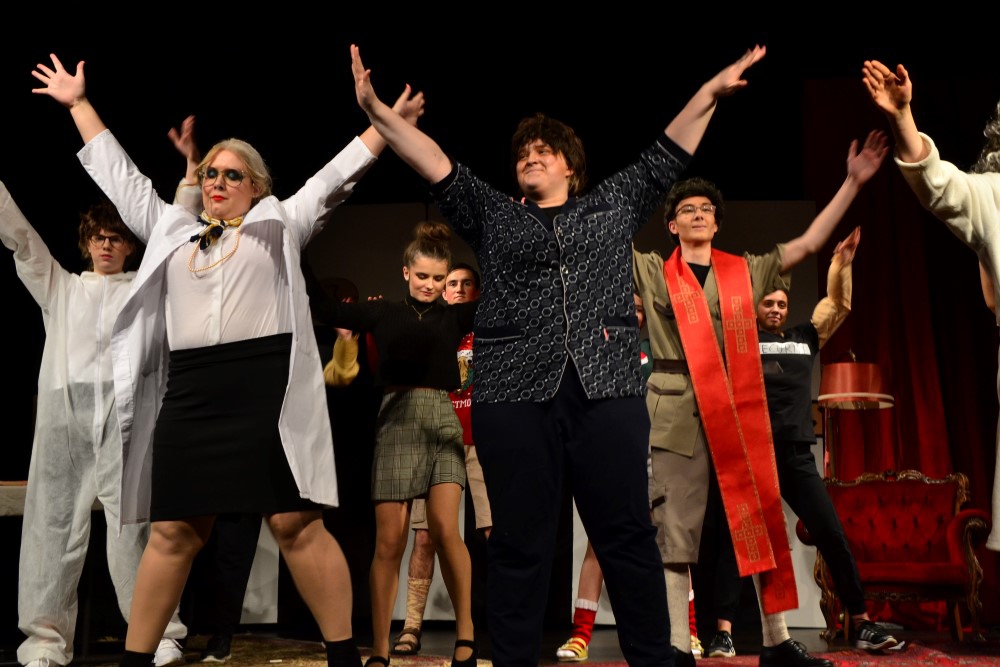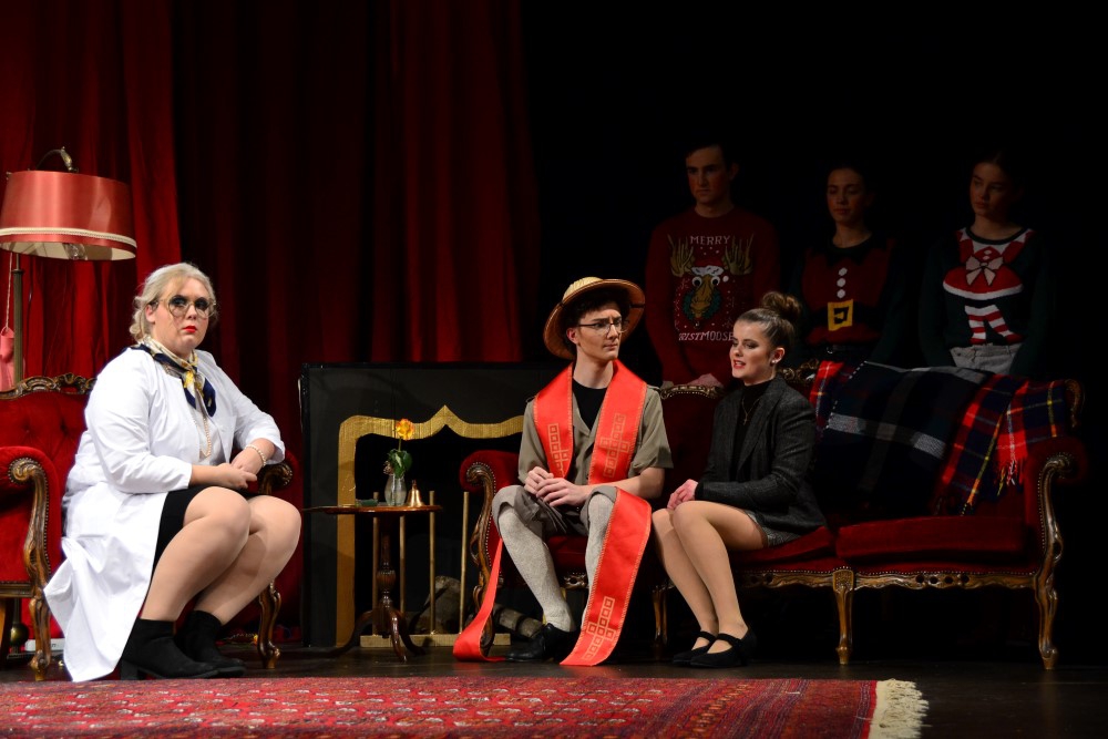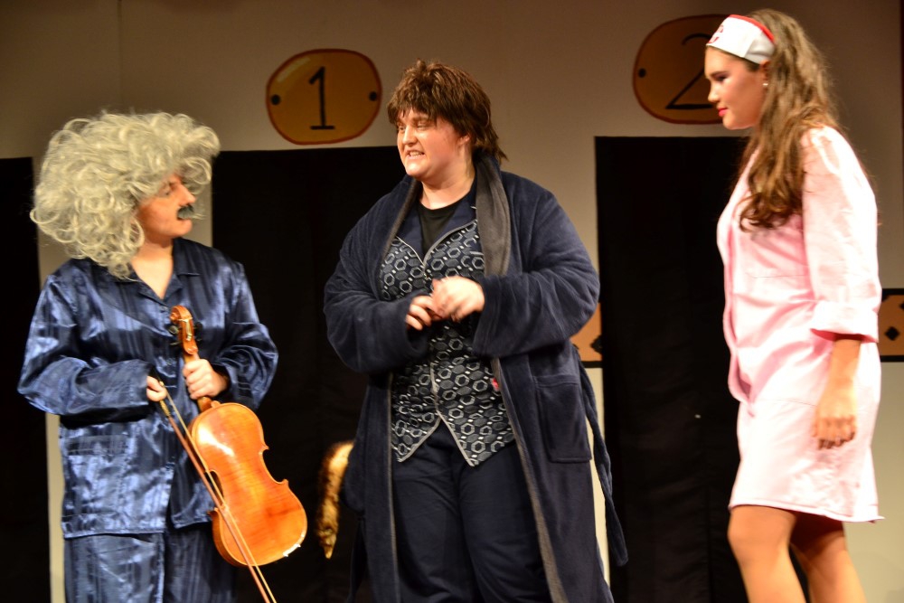Zwanzig Schauspielerinnen und Schauspieler inszenierten das immer noch brandaktuelle Stück „Die Physiker“ von Friedrich Dürrenmatt. Hierbei gab es eine Besonderheit, die zugleich das schauspielerische Können und die Wandelbarkeit der Schülerinnen und Schüler unter Beweis stellte: Es gab jeweils unterschiedliche Besetzungen, sodass ein Großteil der Akteure in verschiedene Rollen schlüpfte. So zum Beispiel Zoe Huber: Am ersten Abend noch als Kriminalinspektor Voß mit Scharfsinn ermittelnd, kümmert sie sich am zweiten Abend als Oberschwester Martha aufopferungsvoll um die Bewohner der Anstalt. Merle Altegoer verkörpert inbrünstig Möbius, den "genialsten Physiker" der Gegenwart. Er hat die sogenannte Weltformel berechnet, eine Entdeckung, die die Menschheit auslöschen könnte, sollte sie in die falschen Hände geraten. Möbius gibt vor, ihm erscheine der König Salomo, und lässt sich als Verrückter in das Sanatorium „Les Cerisiers“ unter der Leitung der buckligen Irrenärztin Mathilde von Zahnd (Elena Müller, Jennifer Weimann) einweisen. Wie sich herausstellt, spielt Möbius den Geisteskranken in Bademantel und mit ausgestopftem Frettchen in der Tasche in der Hoffnung, dass er so als unglaubwürdig gelte und seine Forschungsergebnisse als nicht weiter relevant eingestuft würden.