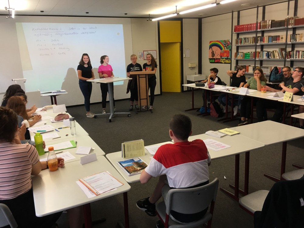 Die diesjährigen Stufentage der Klasse 9 waren für die Schüler als auch für die Lehrkräfte mit zahlreichen neuen Erfahrungen verbunden, denn den Schülern wurde erstmals das Konzept des Debattierens näher gebracht. Auch die Lehrkräfte mussten sich im Voraus erstmal in das Thema einlesen, jedoch führte eine gute Zusammenarbeit zwischen Lehrern und Schülern zu einem zufriedenstellenden Ergebnis am Ende der zwei Tage. Los ging es am Donnerstagmorgen mit zwei kurzen Einführungsfilmen zum Thema Debattieren, damit jeder eine grobe Vorstellung bekam, was es überhaupt heißt zu debattieren. Kurz zusammengefasst gibt es beim Debattieren immer eine Pro- und eine Contra-Seite, welche jeweils die Gegenseite mit Argumenten, Thesen und Beispielen von ihrer Meinung zu überzeugen versucht. Mit diesem Funktionsschema und weiteren Regeln, welche beim Debattieren zu beachten sind, wurde auf ein Ziel am Ende der zwei Tage hingearbeitet: Die Auswahl der Klassensieger. Diese haben nun die Möglichkeit gegeneinander anzutreten und am Ende einen Schulsieger auszuwählen, welcher dann in weiteren Wettbewerben das Hans-Furler-Gymnasium vertreten wird. Wir drücken die Daumen und hoffen auf spannende Debatten!