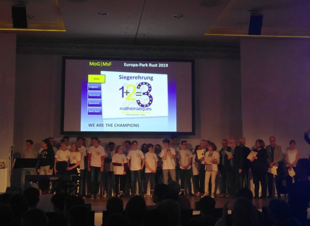 Nur noch neun Rechenaufgaben trennten sie von dem Titel. Auch in diesem Jahr kämpften im regionalen Finale des internationalen Rechenwettbewerbs „Mathe Ohne Grenzen“ die 12 besten Klassen aus Südbaden und benachbarten Kantonen und Departements der Schweiz und des Elsass um den ersten Platz. Vor der Kulisse des Ballsaals Berlin im Ruster Europa-Park zermarterten sich die Schüler die Köpfe über durchaus komplexe Aufgaben. Der Wettbewerb dient nicht nur der Förderung der Mathematik, sondern auch der Pflege grenzüberschreitender Beziehungen. Es gewann in diesem Jahr ein Klasse des Gymnasiums Hausach, die sich mit überragenden 131 Punkten gegen die anderen elf teilnehmenden Klassen durchsetzte. Mit 113 Punkten folgte das Lise-Meitner- Gymnasium aus Grenzach-Wyhlen und knapp dahinter auf dem dritten Platz die Kantonsschule Zürcher Oberland aus Wetzikon. Nach der anstrengenden Kopfarbeit und der darauffolgenden spannenden Siegerehrung durften alle Teilnehmer den restlichen Tag im Park verbringen und zur Belohnung für ihre Mühen die gebotenen Attraktionen genießen.