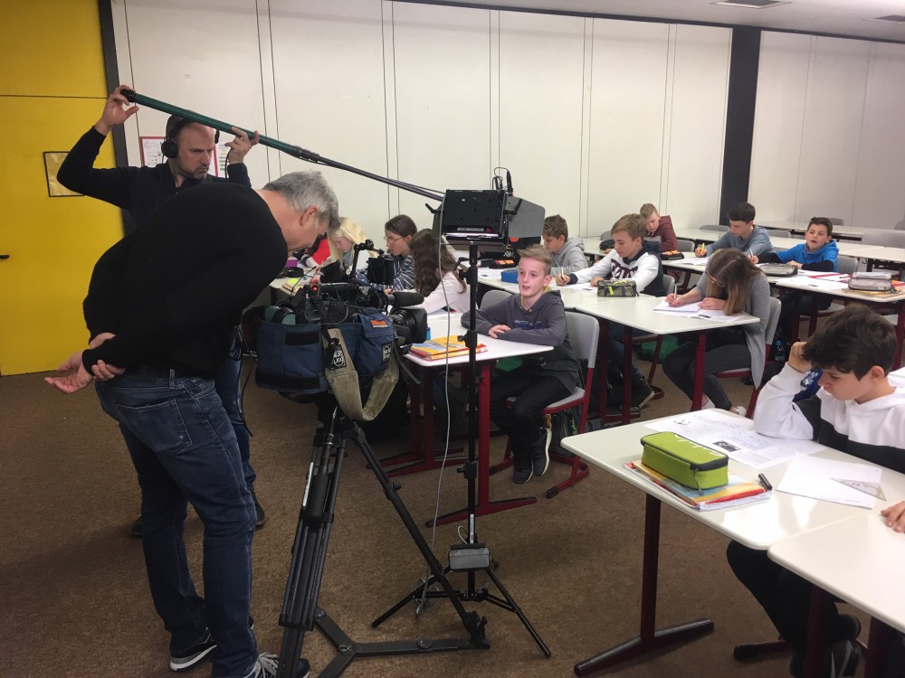 Mittlerweile ist es eine schöne Tradition, dass ein Team des deutsch-französischen Fernsehsenders ARTE ans HFG kommt, damit Unterstufenschülerinnen und -schüler des bilingualen Zugs ihre Fragen zu einem bestimmten Thema vor der Kamera stellen können. In der Nachrichtensendung Arte Junior finden diese Fragen dann Berücksichtigung. Dieses Mal drehte sich alles um das Thema Sklaverei, denn der Beitrag behandelt den Internationalen Tag zum Gendenken an die Opfer von Sklaverei, der am 25. März begangen wird. Die Aufregung war groß, als die Schülerinnen und Schüler im Scheinwerferlicht ihre Fragen auf Deutsch und Französisch in die Kamera sprechen durften.