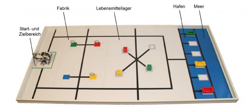 Der Roboter muss dabei Aufgaben, die in diesem Jahr unter dem Motto "Food matters" zusammengefasst sind, auf einem 3m² großen Parcours lösen, z.B. Objekte transportieren, nach Größe oder Farbe sortieren.