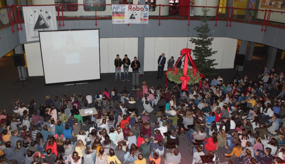 In einer außerordentlichen Schulversammlung ehrte das Hans-Furler-Gymnasium sein erfolgreiches WM-Roboter-Team. Die HFG RoboS errangen bei der WM der WRO in Thailand den hervorragenden 5. Platz. Das Team um Enzo Huber, Philippe Rendler und Lucas Romier erhielt aus den Händen von Bürgermeister Christoph Lipps und Schulleiter Peter Bechtold im PZ Präsente zur Anerkennung der großartigen Leistung.