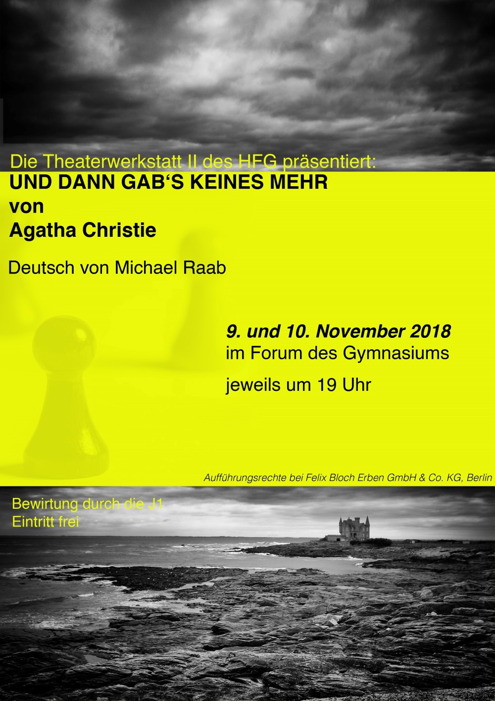 Die Theaterwerkstatt II, unter der Leitung von Sabrina Vogt-Ehmann, zeigte sich mit ihrer Vorführung von Agatha Christies Kriminalromans „Und dann gab´s keines mehr“ von einer ganz besonderen Seite und lud zum Miträtseln ein. Zehn Personen, aus den unterschiedlichsten gesellschaftlichen Kreisen, erhielten eine Einladung des ominösen Gastgeber Mister A. N. O’Nym. Dieser lädt sie zu einem Wochenendaufenthalt auf der abgeschiedenen „Kriegerinsel“ ein. Die anfängliche Idylle erweist sich jedoch schnell als trügerisch. Nach dem ersten Dinner ertönt eine Schallplatte, darauf zu hörende Stimme beschuldigt alle Anwesenden der Insel den Tod eines oder mehrerer Menschen auf dem Gewissen zu haben.