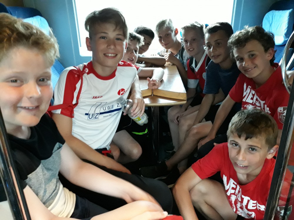 Früh morgens ging es los, denn der Weg nach Lörrach war lang. Doch die Fahrt mit dem ICE verging schnell, machte das Kartenspielen doch viel Spaß. Zu Beginn des Turnieres musste die Gruppenphase überstanden werden. Dies gelang unserem HFG-Team, das aus neun Fünft- und Sechstklässlern bestand, richtig gut. Alle Spiele wurden 1:0 gewonnen und so war man Gruppensieger. Nun ging es gegen den Gruppenzweiten der anderen Gruppe. Hochmotiviert legte das Team los und schoss schnell ein Führungstor. Doch statt dieses Ergebnis nur zu verteidigen, griff das HFG-Team weiter an und es vielen noch 4 weitere Tore.  Ohne ein Gegentor kamen die HFG-Jungs ins Finale dank ihrer starken Abwehr und einem klasse Torwart. Trotz eines engagierten Kampfes ging das Finale gegen Freiburg dann  0:2 verloren. Kurz war man enttäuscht, aber schon auf der  Rückfahrt überwog der Stolz auf die tolle Leistung.