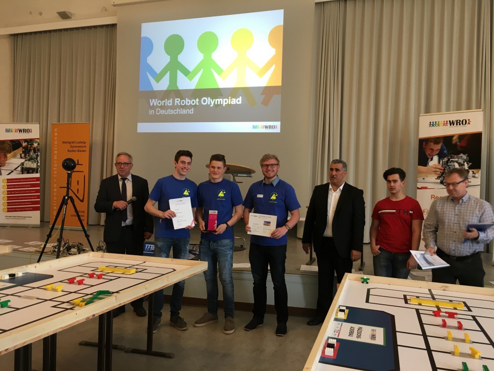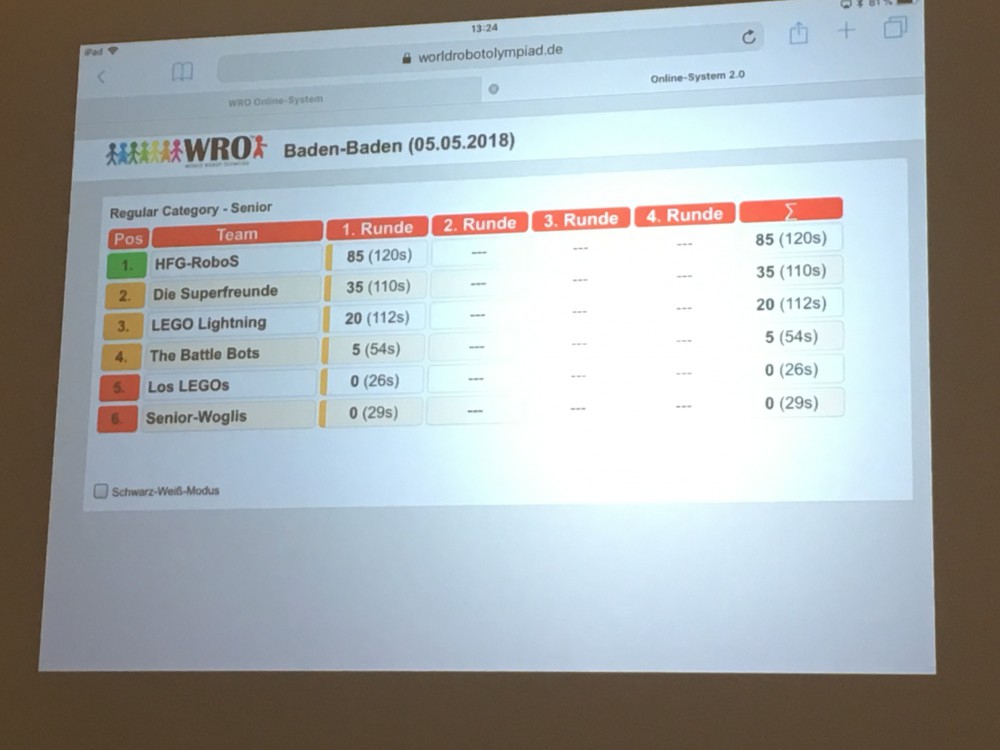 Auch im Ablauf unterscheidet sich die WRO grundlegend von der FLL. Der Wettbewerbstag wird aufgeteilt in zwei große Kategorien: Bau- bzw. Umbauphasen und Wertungsläufe. Der Roboter muss in Einzelteilen zum Wettbewerb gebracht werden und in den insgesamt 4 Bauphasen neu gebaut werden, lediglich die Programmierung darf schon vorgefertigt mitgebracht werden. In den 4 Spielrunden geht es dann ums Ganze. Jedes Team darf in jeder Spielrunde seinen Roboter nur einmal starten, danach muss dieser alle Aufgaben an einem Stück lösen. Doch all diese Hürden stellten für die HFG-RoboS kein Problem dar. Denn jedes Teammitglied hatte einen Part des Roboters auswendig gelernt und konnte diesen auswendig aufbauen. In den Spielrunden erreichten die HFG-RoboS den Tagesrekord mit 105 von insgesamt 185 möglichen Punkten und gewannen damit deutlich den Wettbewerb. Durch Bilder, Videos, Anfragen zur Bauanleitung und zur Programmierung war der Oberkircher Roboter der wohl meist gefragteste Star Baden-Badens an diesem 5. Mai. Als Preis erhielten die drei Jungs einen Gutschein über ein Wochenende samt Teilnahme am schulergänzenden Ausbildungsprogramm Master MINT des Instituts für Jugendmanagement. Dort werden sie mit Seminaren rund um die Naturwissenschaften weiter gefördert.