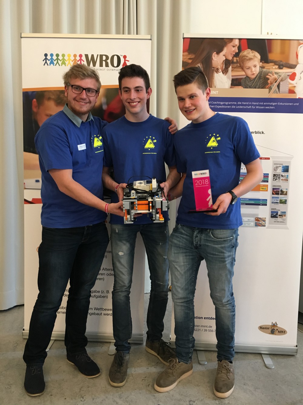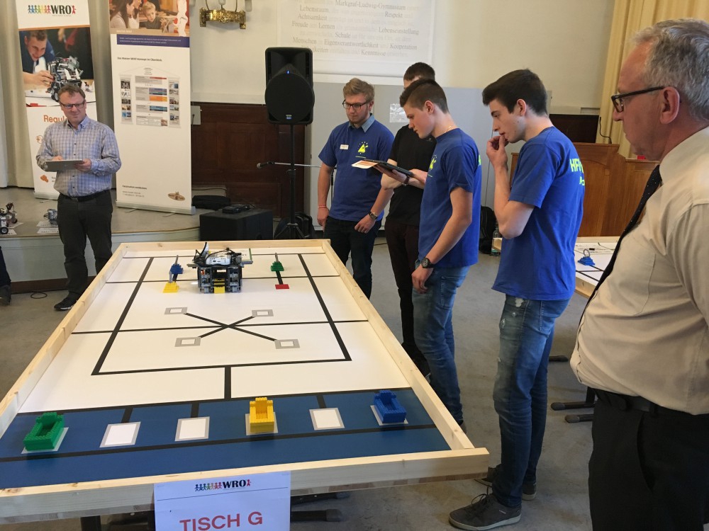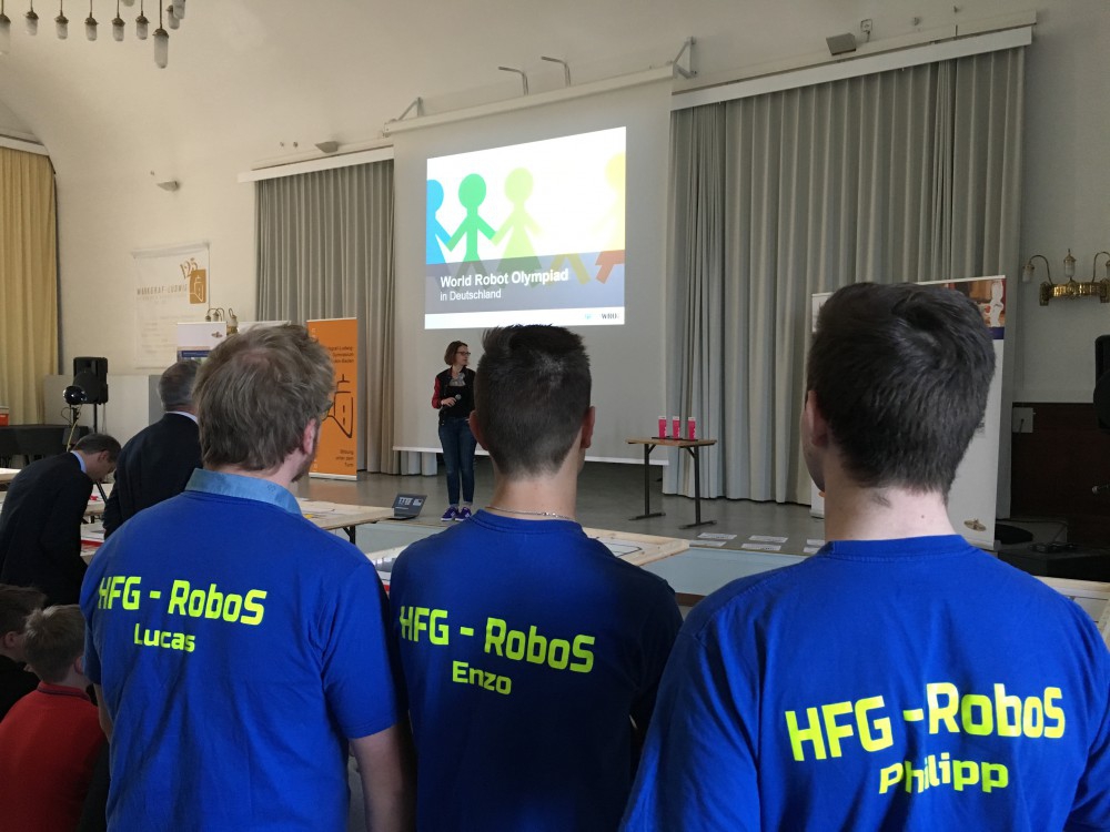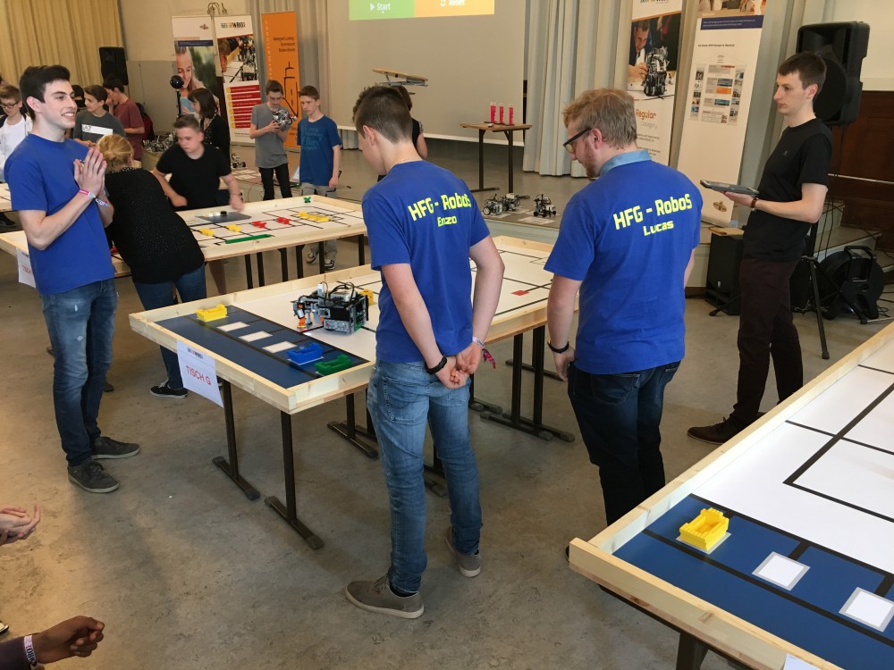 Nach dem traurigen und frühzeitigen Ausscheiden der HFG-RoboS aufgrund einer Jury-Fehlentscheidung im Semi-Finale der First Lego League in Rockenhausen, wollen es die HFG-RoboS nun noch einmal wissen. Das dieses Mal in kleiner Besetzung auftretende Team, vertreten durch Philipp Rendler, Enzo Huber und Lucas Romier, hat sich deshalb einem neuen Wettbewerb zugewandt, der WRO – World Robot Olympiad – und dies mit einem direkten großen Erfolg.