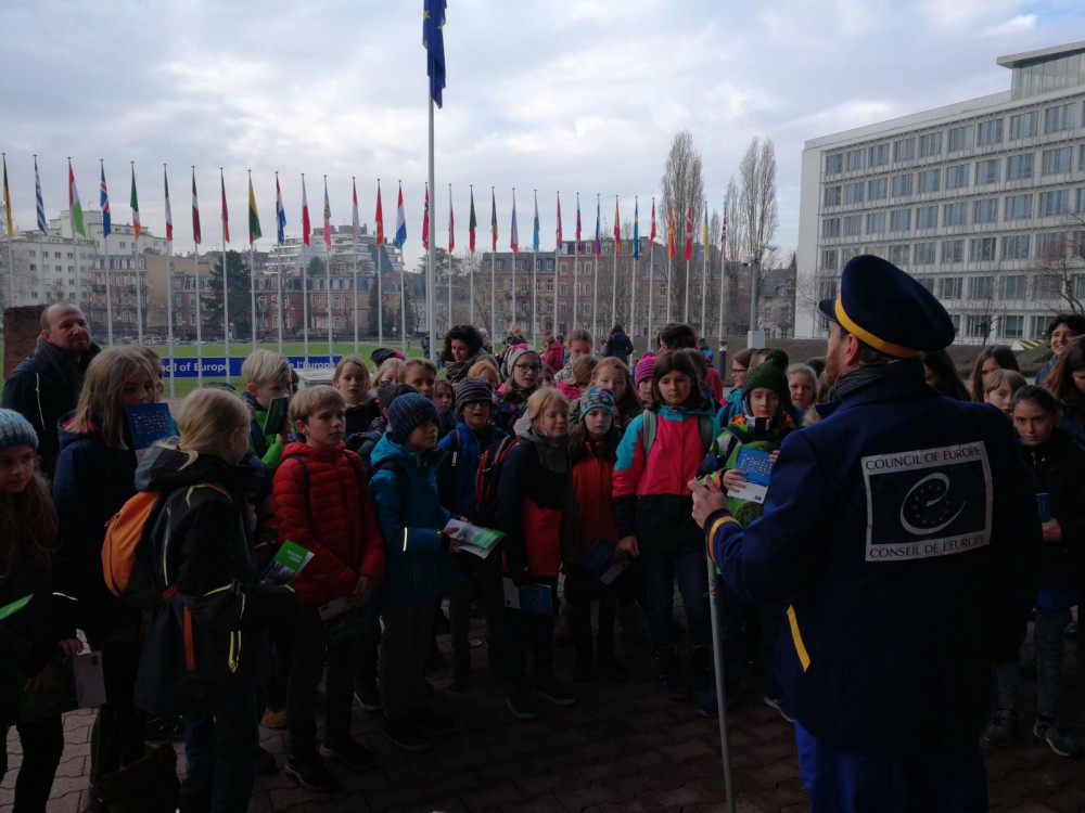 Nach einer kurzen Einführung am HFG ging es vom Bahnhof in Oberkirch aus Richtung Straßburg. Schon die Fahrt mit der Bahn und der neuen Tramverbindung über den Rhein war für unsere Jüngsten ein besonderes Erlebnis, welches ihnen noch mal spürbar unsere Grenznähe und die offenen Grenzen zu unseren Nachbarn aus Frankreich verdeutlichte. Vor Ort wurden wir schon freudig erwartet und die Kinder konnten anhand der vielen Flaggen vor dem Palais de l’Europe ihre Länderkenntnisse testen. Nach einem kurzen Informationsfilm über die Geschichte und die Aufgaben des Europarates durften die Fünfer den Plenarsaal besichtigen, in dem schon Persönlichkeiten wie der Papst, Angela Merkel und viele andere vorgesprochen haben. Aktiver wurde es dann bei den nächsten beiden Stationen, bei denen zum einen die Europahymne „Ode an die Freude“ Karaoke gesungen, und zum anderen die Aufgaben des Europarates im Bereich Sport erkundet wurden, natürlich samt Geschicklichkeitsspielen. Abschließend gab es noch ein Gruppenbild sowie ein paar Geschenke für alle, bevor es dann wieder in die Tram und Richtung Oberkirch ging.