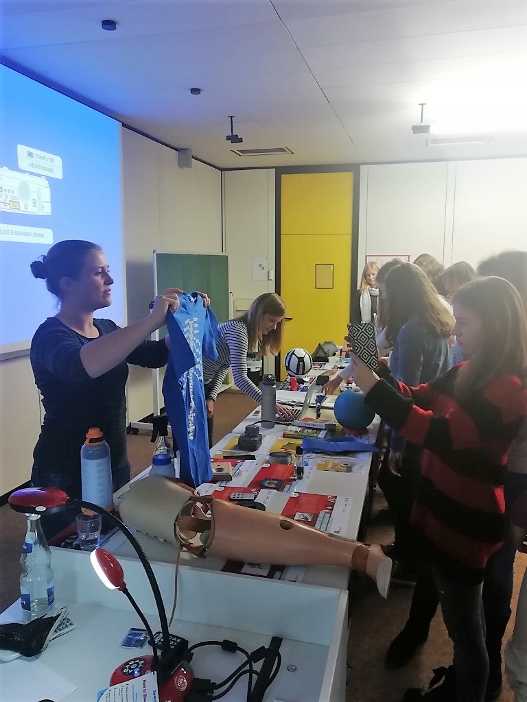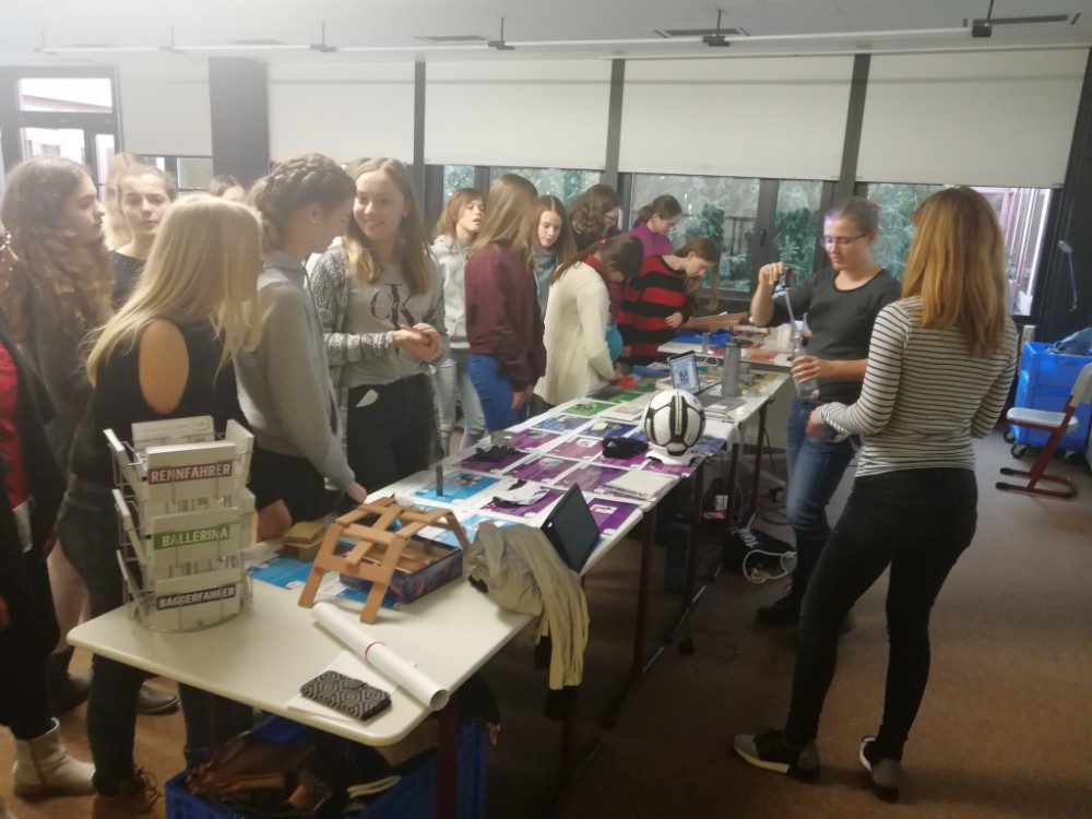 Neunzig Minuten lang präsentierten die zwei MINT-Akademikerinnen Carolin Birk und Cathrin Brinkmann ihnen mithilfe einer interaktiven Multimedia-Präsentation und Hightech zum Anfassen verschiedene Themenfelder. Zur Auswahl standen die Bereiche „Menschen helfen“, „Mobilität“, „Welt retten“, „Lifestyle“, „Arbeiten“ und „Wohnen“, die jeweils noch einmal in mehrere Aspekte untergliedert waren. So wurden die konkreten Inhalte und auch die Vielfalt der naturwissenschaftlichen Berufe vermittelt. Die Schülerinnen durften selbst entscheiden, welche Themen sie genauer erkunden wollten und gestalteten dadurch den Verlauf der Veranstaltung mit.