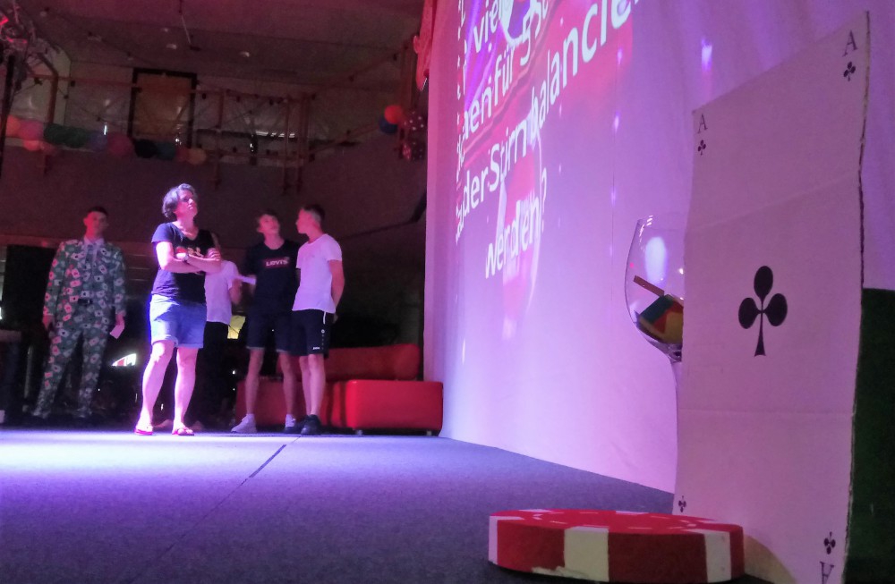 Der eigentliche Abistreich fand jedoch erst in der 5. und 6. Stunde statt. Wie üblich gab es einen Film zum diesjährigen inoffiziellen Abimotto: "Abivegas - 12 Jahre durchgepokert". Zwischen den einzelnen Filmsequenzen gab es immer wieder Spiele, in denen Schüler gegen Lehrer antreten mussten. Dabei standen sowohl ein Quiz als auch sportliche Einlagen auf dem Programm. Durch das Programm führte der Schülersprecher Florian Obrecht, zum Thema passend als Spielleiter in einem Anzug voller Spielkarten, zusammen mit Jule Streif.