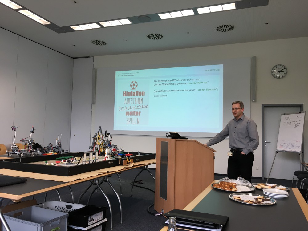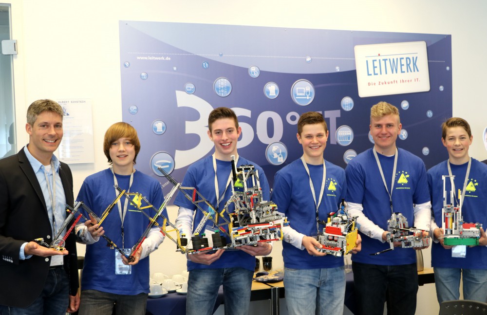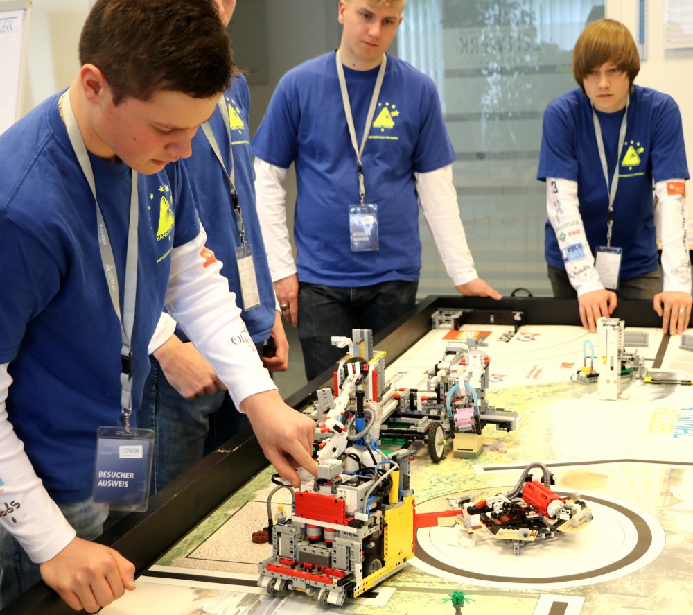Hierbei konnten sie über den umfangreichen Wettbewerb berichten und ihren Roboter am Wettbewerbstisch vorstellen. Der Roboter sorgte mit seinen Fähigkeiten bei allen anwesenden Mitarbeitern für große Aufregung. Geprägt von gegenseitiger Wertschätzung und Hochachtung kamen interessante Fragen zur Konstruktion und der Programmierung des Roboters wie auch zum Forschungsauftrag auf, der ebenso wichtig wie das Robot-Game bei der First-Lego-League ist.