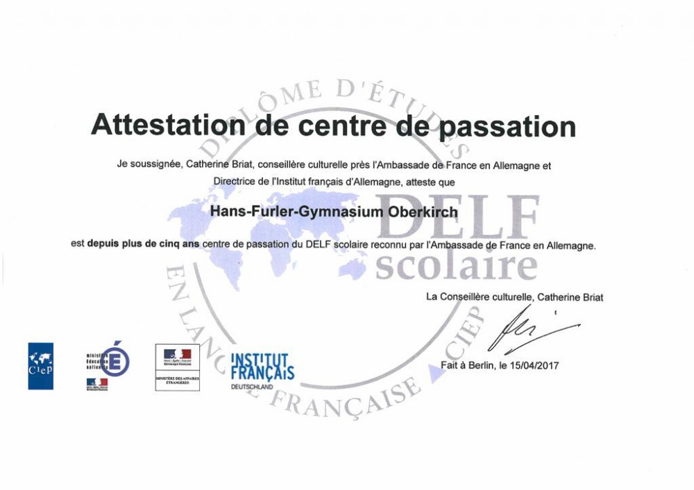 Am Hans-Furler-Gymnasium legen seit vielen Jahren zahlreiche Schülerinnen und Schüler das Sprachdiplom Delf scolaire ab. Nun wurde die Schule von der französischen Botschaft als offizielles "Centre de passation" zertifiziert.