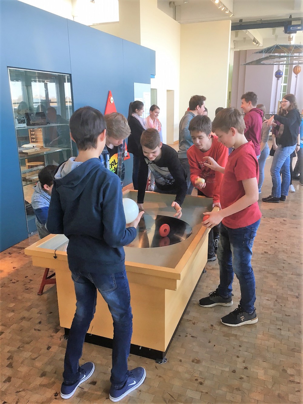 Um 8:30 Uhr brachen die Schülerinnen und Schüler Richtung Mannheim auf. Das TECHNOSEUM ist eines der größten Technikmuseen in Deutschland. Die Ausstellung präsentiert auf mehreren Stockwerken 200 Jahre Technik- und Sozialgeschichte. Im Museum in Mannheim angekommen starteten die Schülerinnen und Schüler klassenweise in verschiedenen Stockwerken zunächst zur eigenständnigen Erkundung. Es werden dort alle möglichen technischen Gerätschaften vom 17. Jahrhundert bis heute ausgestellt wie zum Beispiel alte Kompasse, Kräne und Ferngläser. An Experimentierstationen können die Schülerinnen und Schüler selbst aktiv werden und Dinge ausprobieren.