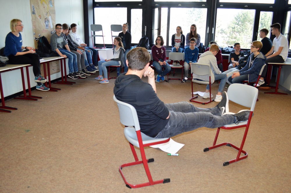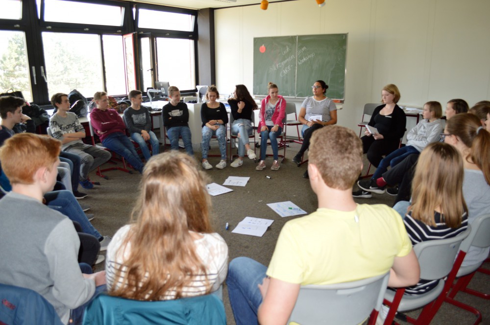 Der Schülerworkshop konzentrierte sich auf die momentane Syrienkrise und den eng damit verbundenen Themenfeldern Flucht und Asyl. Eingeführt in das Thema wurden die Schülerinnen und Schüler unter anderem mit einem Spiel, in dem sie eine gewisse Anzahl an Schülerinnen und Schülern oder Stühlen einem Kontinent nach bestimmten Kriterien zuordnen mussten. Die Schätzungen lagen teilweise weit daneben, besonders, als die Anzahl der beherbergten Flüchtlinge jedes Kontinentes geschätzt werden sollte. Danach befragt, wie viel Prozent der Flüchtlinge wohl nach Europa kämen, waren die Schätzungen deutlich zu hoch. Dies führte allen vor Augen, dass sie nicht so gut informiert sind, wie sie das zu sein glauben.
