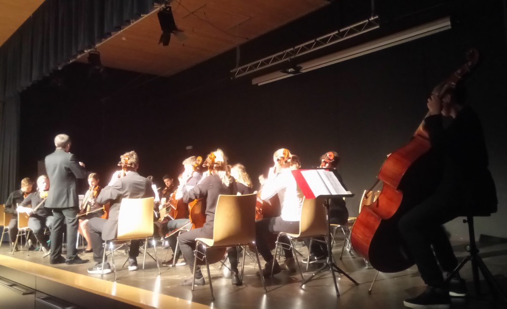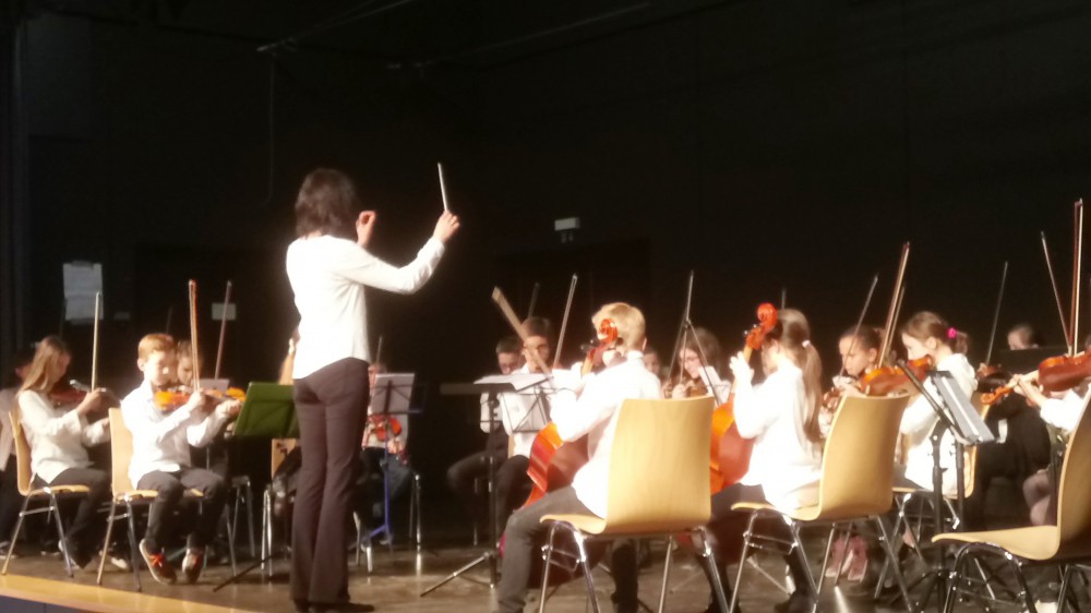 Das Vororchester der Musikschule Achern/ Oberkirch und des HFG legte nach und überzeugte, dirigiert von Anna Münchenberg, mit einer gekonnten Interpretation der Oregano-Suite von J. v. d. Dungen und einer gelungenen Mischung aus beschwingten und nachdenklichen Melodien. Der unterschiedliche Charakter der Tanzsätze kamen dabei sehr gut zur Geltung, so dass die Zuschauer sich von der dynamischen Bandbreite an Klangfarben davontragen lassen konnten.