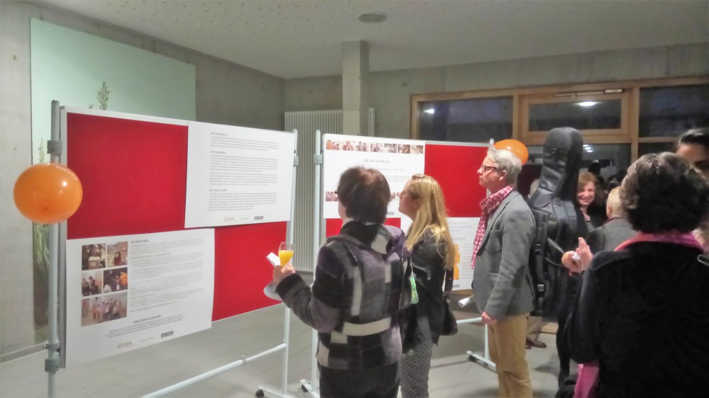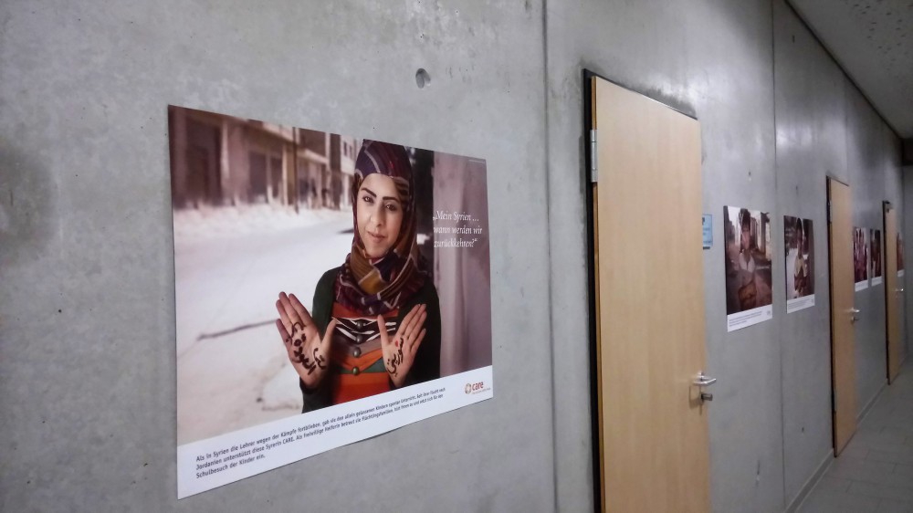 Ganz andere, aber ebenfalls nachdenkliche Töne schlug Leah Hanraths, Referentin der internationalen Hilfsorganisation CARE, an und warb um die Unterstützung der zahlreichen Zuhörer. 13,5 Millionen Menschen seien vom Konflikt in Syrien betroffen, rief sie in Erinnerung. "6,6 Millionen wurden aus Syrien vertrieben", ergänzt sie und stellt die Arbeit der Hilfsorganisation vor: in Syrien selbst sowie in den Flüchtlingslagern in Jordanien und im Libanon fördert CARE Projekte und auch in Deutschland leisten sie Integrationshilfe. Außerdem bieten sie Workshops an Schulen an, um den Schülerinnen und Schülern das Thema "Flucht und Asyl" näher zu bringen. Auf einen solchen Workshop dürfen sich die 9. Klässler des HFG am kommenden Freitag freuen. Sie lud die interessierten Besucher außerdem dazu ein, die bei diesem Anlass eröffnete DEAR WORLD-Ausstellung im Forum des HFG zu besuchen. Auf 14 Fotografien präsentieren syrische Flüchtlinge Botschaften an die Welt, die sie sich auf Arme und Hände geschrieben haben. "Ich will mein altes Leben zurück" heißt es auf dem einen, "Hand in Hand können wir die Welt verändern", auf einem anderen. Die Bilder stimmen nachdenklich, machen betroffen, appellieren an unser Mitgefühl: Schaut nicht weg, seht uns in die Augen, helft uns.