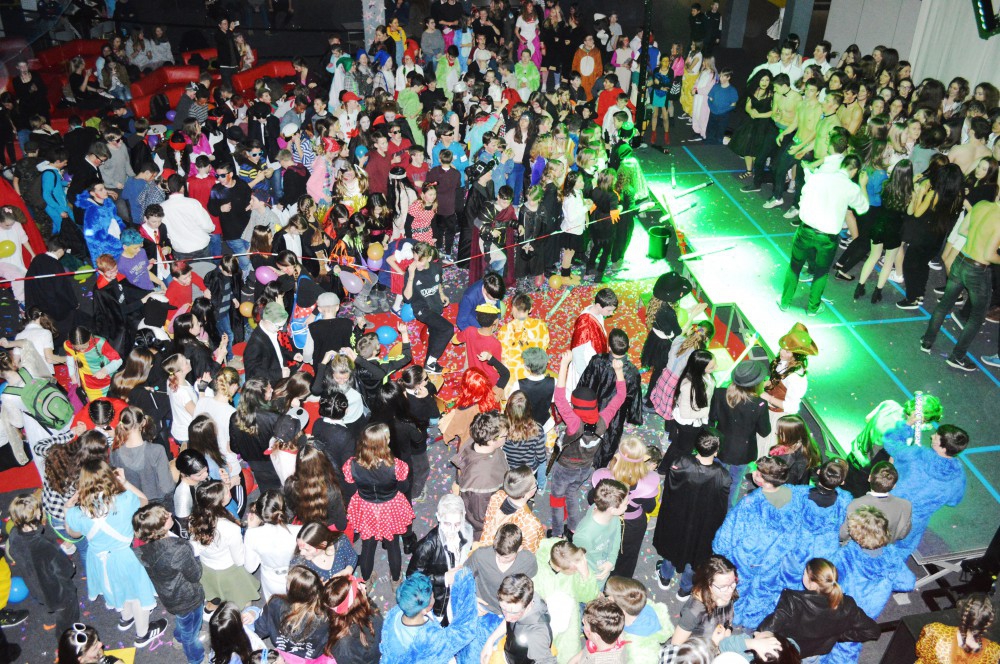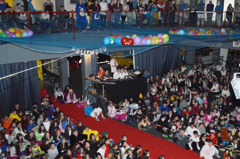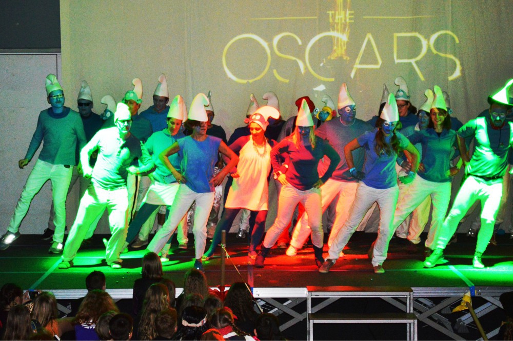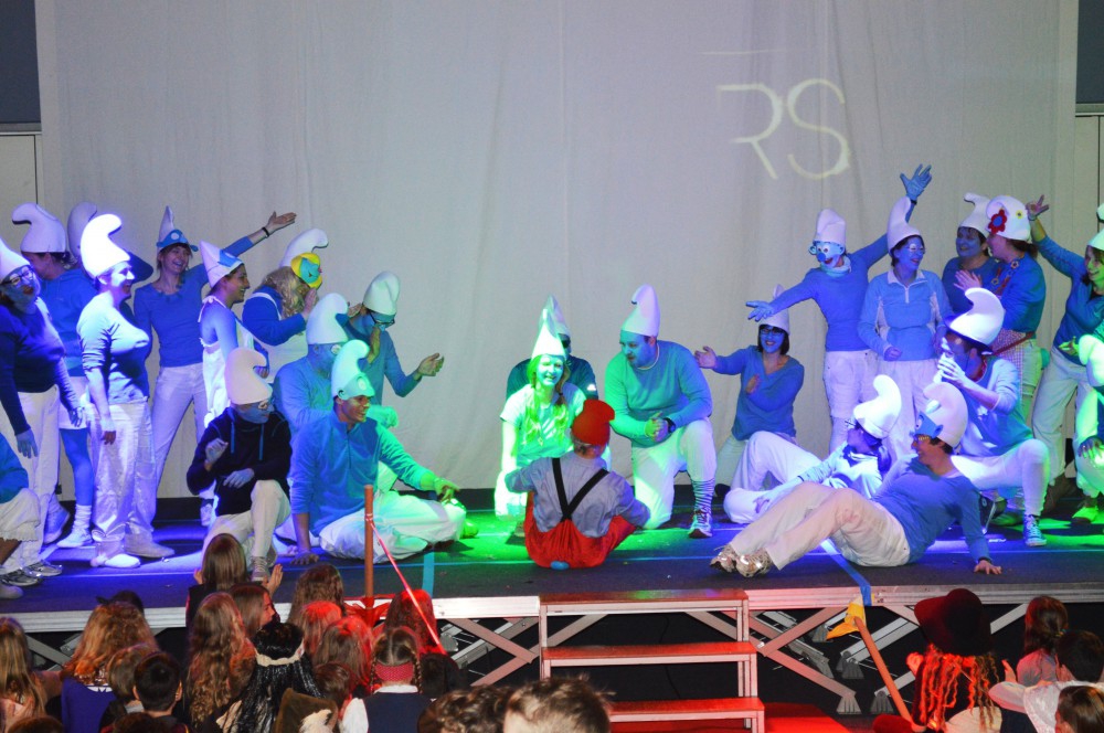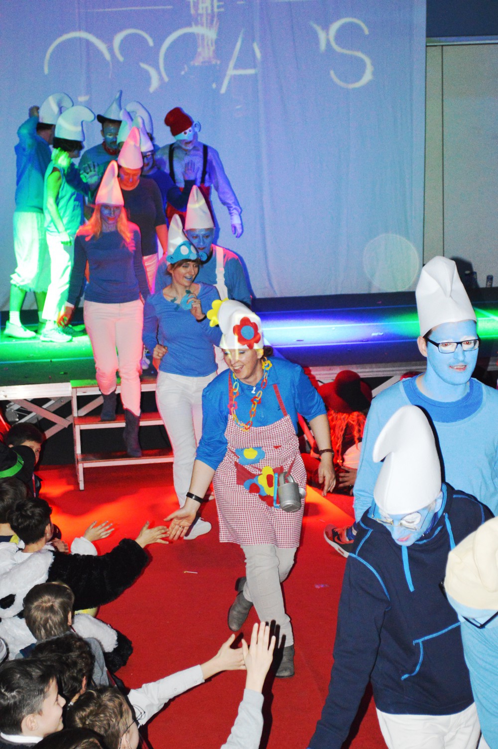 Schon als die Schüler und Schülerinnen morgens das Schulgelände betraten, wallte das "Fasentsfeeling" auf: Mit Schminke und Tannenbaumnetzen, in denen Jüngere gefangen wurden, erwarteten die J1-Schüler die Ankömmlinge und freuten sich, ihnen wortwörtlich ihren farbigen Stempel aufzudrücken. Doch erstmal warteten noch vier Stunden Unterricht auf die Schülerinnen und Schüler, bevor sich um 11:11 Uhr die gesamte Schulgemeinschaft im PZ versammelte, um der großen Feier beizuwohnen. Diese stand dieses Jahr unter dem Motto "Film" und getreu diesem Motto war auch die Dekoration sowie das Programm zusammengestellt worden. Das bestand nämlich aus dem von der Jahrgangsstufe produzierten Film und den traditionellen Lehrer-Schüler-Spielen, in denen unter anderem Filmcharaktere erraten, Zitate ihren entsprechenden Filmen zugeordnet und eine Lehrerversion von "4 Bilder, 1 Wort" gespielt wurde. Passend zum Thema erhielt das jeweilige Gewinner-Team der Duelle einen Oscar, wobei sich schon bald abzeichnete, dass sich die Oscars auf der Schülerseite häuften, während die Lehrer oftmals leer ausgingen. Doch davon ganz unbeeindruckt legte das Lehrerkollegium - an diesem Tag als Schlumpfbande verkleidet - im Anschluss an die Wettkämpfe einen filmreifen Tanz auf der Bühne hin. Und auch die Jungs der Jahrgangsstufe 1 performten einen Tanz, der dem der "Schlümpfe" in nichts nachstand.
