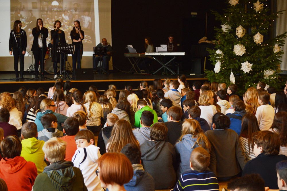 Nach der dritten Stunde versammelten sich die Schüler der Klassen 5 bis 7 im Forum. Den Anfang der Weihnachtsfeier gestaltete die Schulband. Nach einer kurzen Begrüßung stiegen Max Deichelbohrer und Manuel Sutterer (10c) mit einem Gedicht ins Thema ein. Die Aussage war klar: An Weihnachten solle die Gemeinschaft im Vordergrund stehen und nicht Essen und Geschenke, wie es heute oft der Fall ist.
