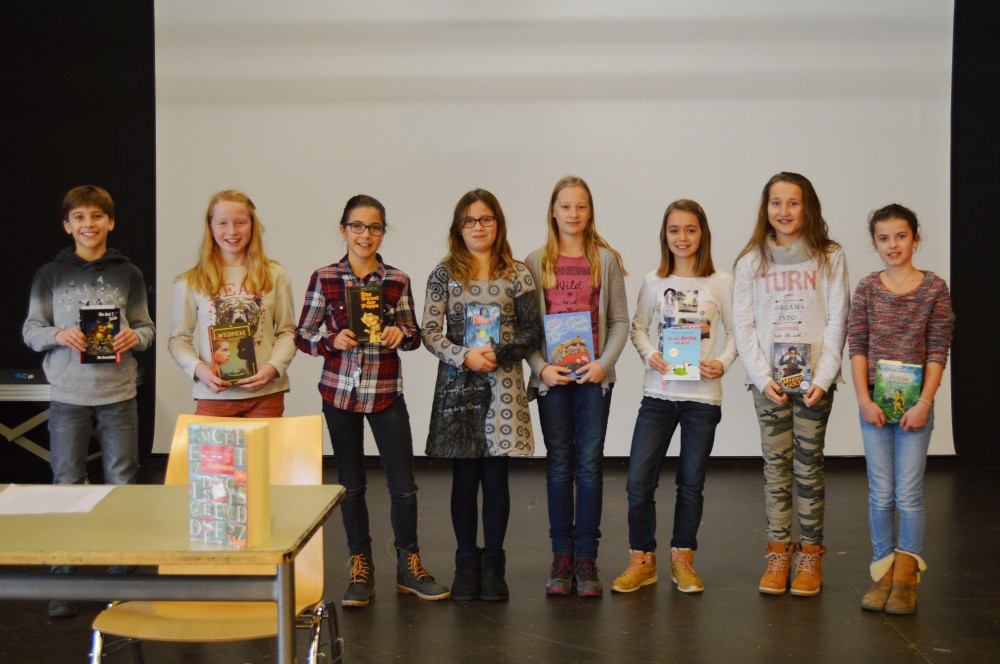 Die Klassensiegerinnen und Klassensieger mit den von ihnen vorgestellten Büchern.